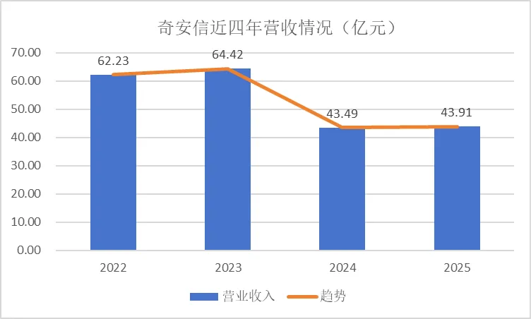 奇安信2022年整体营业收入62.23亿,2023年整体营业收入64.42亿,2024年整体营业收入43.49亿,受大环境和各种因素影响,2024年营收有较大幅度下降,2025年业绩快报显示应收为43.91亿。