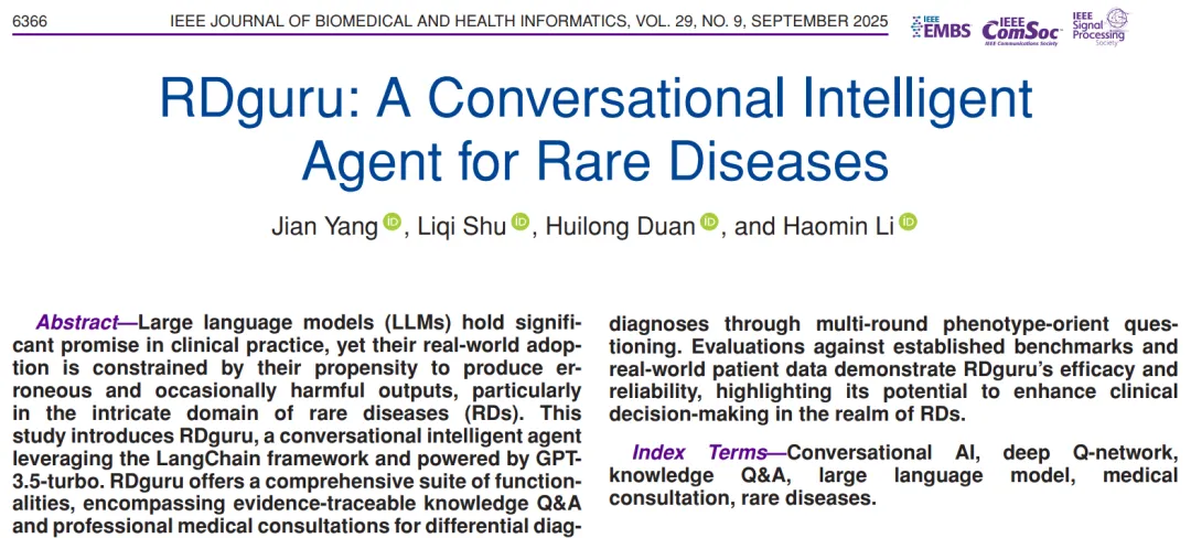 本研究针对大语言模型在罕见病领域易生成错误信息、现有诊断工具存在局限的临床痛点,研发出基于 LangChain 框架、以 GPT-3.5-turbo 为核心的罕见病对话式智能体 RDguru。该智能体整合权威知识源与专业工具,实现证据可溯源的知识问答和专业鉴别诊断服务,其核心创新的基于深度 Q 网络的多源融合诊断模型,融合三种诊断推荐策略提升了诊断召回率。经多维度评估,RDguru 在知识问答的准确性上优于 ChatGPT,针对 238 例罕见病病例的测试显示,其多源融合诊断的 Top5 真实诊断召回率达 63.87%,较现有最优方法提升 5.47 个百分点;同时其表型导向的多轮问诊策略,能有效挖掘诊断相关表型、优化真实诊断优先级。研究证实了 RDguru 的有效性与可靠性,为提升罕见病临床决策水平提供了实用的智能辅助方案。