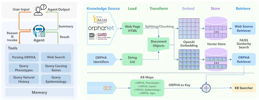 图1. 用于可溯源证据知识问答的检索增强生成框架,包含多个预定义工具,用于解析ORPHA疾病、检索Orphanet、OMIM、GARD等在线知识库,以及查询预加载的Orphadata数据。