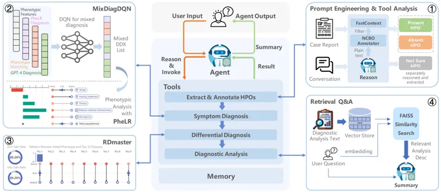 医疗会诊模块:四步连续工作流 ——①表型注释与上下文分析(NCBO Annotator+FastContext 提取 HPO 并标注上下文);②症状诊断(PheLR 提供可解释性);③鉴别诊断(RDmaster 的 AIGGI 指标选表型、多轮问答);④诊断结果分析(生成整合式分析报告)。