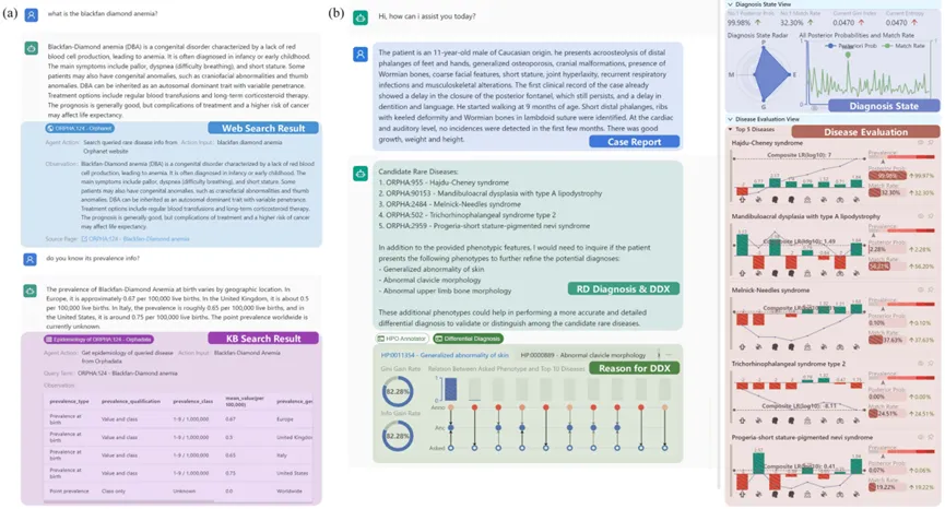 图 3 RDguru 的用户界面。(a)证据可溯源的知识问答界面,额外展示解析后的 Orphanet 疾病,以及从在线知识库或 Orphadata 中查询的信息;(b)工具增强的可解释医疗会诊界面,额外展示由 PheLR 支持的排名前五诊断结果的表型评估、由 RDmaster 支持的鉴别诊断解释,以及诊断不确定性等实时诊断状态。
