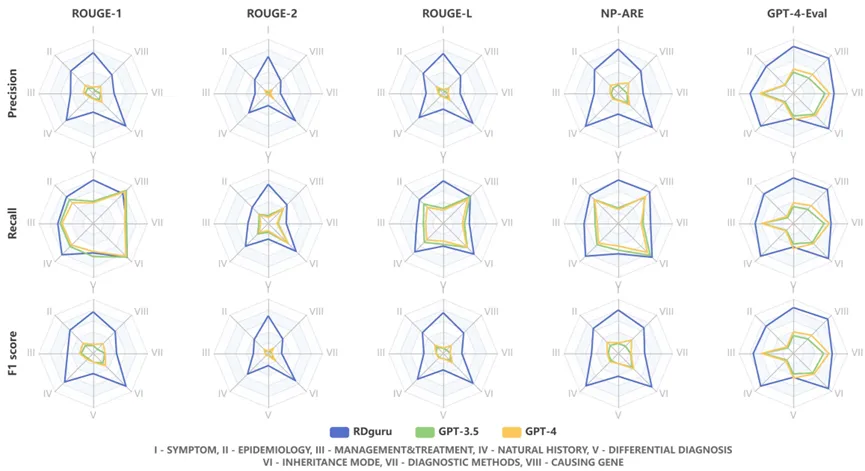 图 4 RDguru 与各类 GPT 模型在 8 个问答维度的知识回答质量评估结果,以权威知识描述为目标,通过 ROUGE 评分、自定义 NP-ARE 和 GPT-4 自动评估计算精确率、召回率和 F1 值,雷达图中分数范围为 0~1。(注:Ⅰ- 症状、Ⅱ- 流行病学、Ⅲ- 疾病管理与治疗、Ⅳ- 疾病自然史、Ⅴ- 鉴别诊断、Ⅵ- 遗传方式、Ⅶ- 诊断方法、Ⅷ- 致病基因)