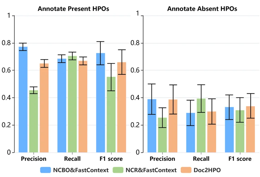 (1)自动化表型注释:NCBO&FastContext 流程在存在表型提取中表现最优(精准率 0.77、召回率 0.68、F1=0.73),缺失表型提取与 Doc2HPO 相当,显著优于 NCR 流程;