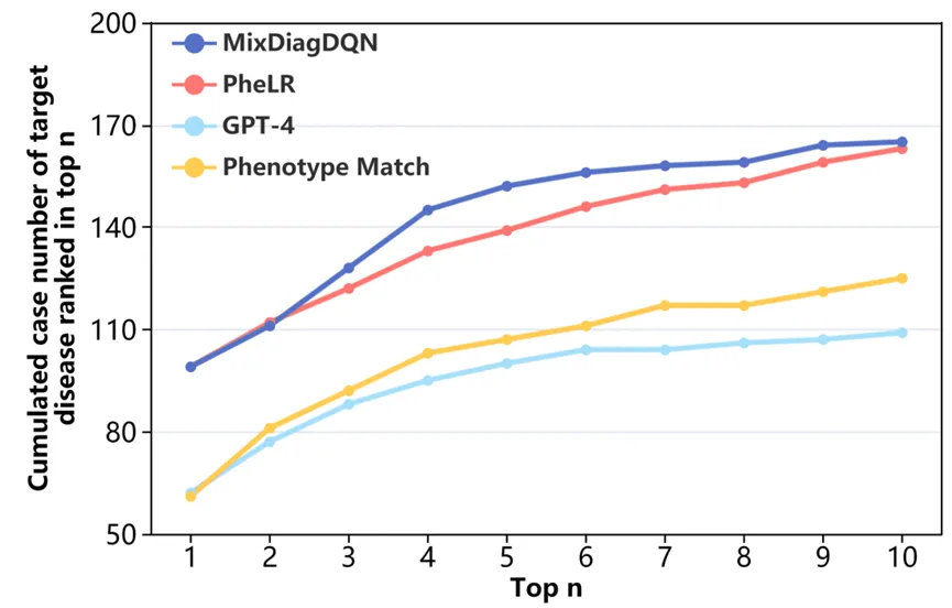 图 6 基于 238 例罕见病病例的表型诊断评估中,MixDiagDQN 模型及其整合的单一方法(PheLR、GPT-4、表型匹配)在排名前 10 的诊断结果中,目标疾病的累积检出数。