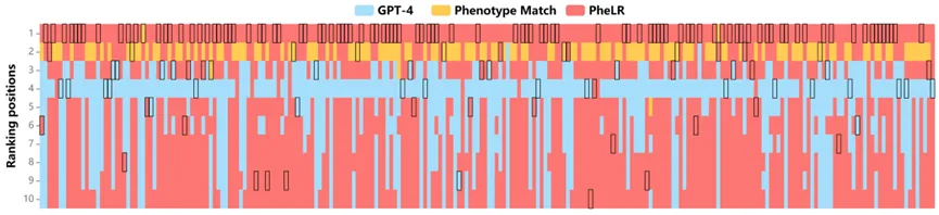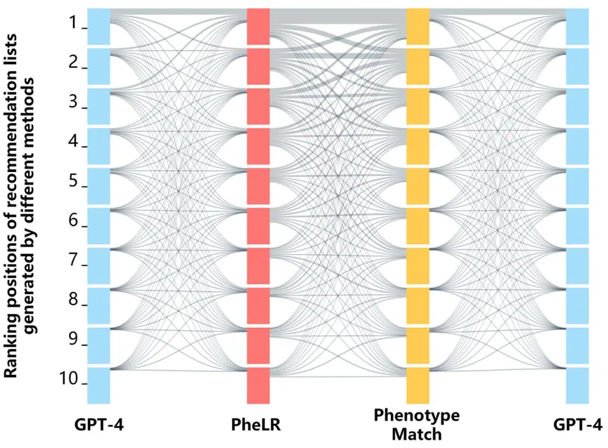 图 8 基于 238 例已发表病例的测试中,PheLR、GPT-4 和表型匹配三种方法排名前 10 的推荐疾病的重叠情况(桑基图),每种方法各位置的样本量均为 238,两个项目间的连线宽度代表对应的疾病重叠数。