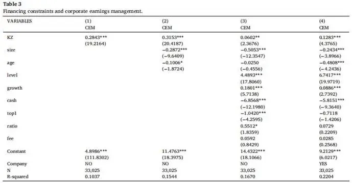 表3列示了不同回归设定下融资约束对企业盈余管理影响的结果,融资约束(KZ)的系数均在5%或1%统计水平上显著为正,充分证明融资约束会加剧企业盈余管理行为。可能的解释是,企业在资金短缺压力下,为获取外部融资需满足放贷门槛,管理层倾向于调整应计项目、操纵非经常性损益以粉饰财务报表,向债权人传递误导性的盈利能力信号,这种机会主义行为成为企业缓解融资困境的短期策略。