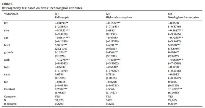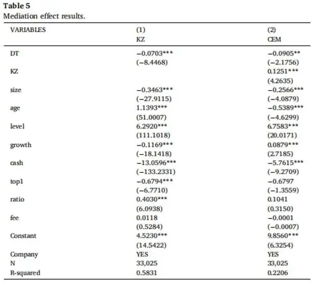 表5列示了中介效应检验结果:列(1)中数字化转型的系数显著为负,表明数字化转型能显著缓解企业融资约束,原因可能包括:数字化转型通过大数据、区块链等技术提升信息透明度,降低银企间信息不对称;数字化运营优化资源配置、提升经营效率,增强企业偿债能力与信用质量;数字金融平台发展拓宽融资渠道,使企业更易获得低成本资金。