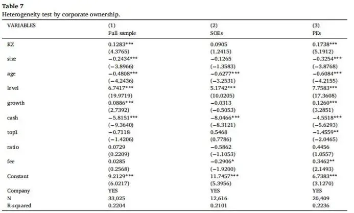 本文按企业产权性质将样本分为国有企业与民营企业,子样本回归结果见表7。民营企业子样本中,融资约束系数在1%统计水平上显著为正;国有企业子样本中,融资约束系数为正但不显著。对比表7结果可见,与国有企业相比,融资约束对民营企业盈余管理行为的促进作用更为显著。