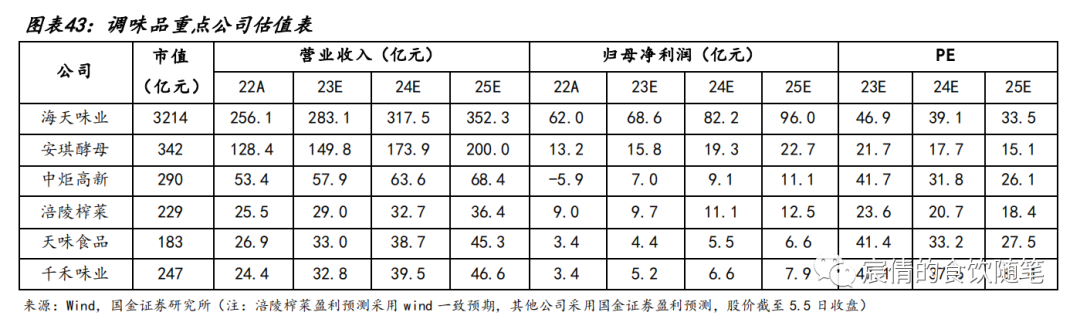 后续展望来看,海天当下仍处于去库存阶段,助力渠道纾困解难,下半年收入端弹性显现,配合大豆成本下降带来的毛利率弹性,业绩可期,全年收入/利润目标+10/+10%完成概率高。千禾在零添加舆论事件后势头强劲,23Q1收入表现奠定顺风开局,为完成23年度股权激励收入目标带来更高确定性,期待公司在流通渠道开拓之下的增长后劲。中炬已走出21年的增长泥淖,22年调味品业务增长近7%,23年经营、管理表现出双改善趋势,有望实现高单至双位数调味品业务收入增长。天味食品22年已经论证改革成效,23年继续精细化渠道管控,有望实现股权激励目标。安琪酵母仍受糖蜜成本压制,但随着水解糖替代率提升,预计成本端压力趋缓,H2迎来阶段性改善。
