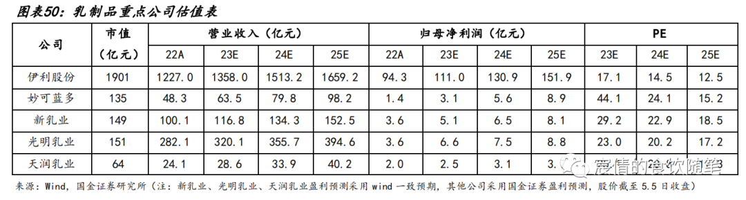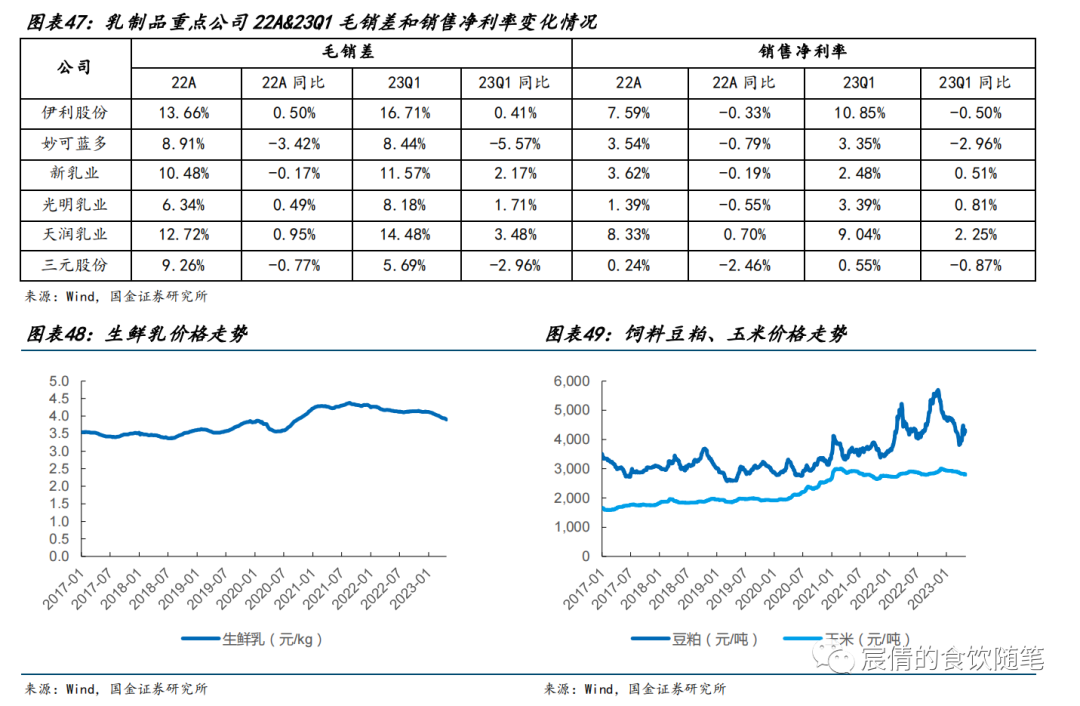 23年展望来看,原奶价格仍处于回落通道,但基于饲料价格高位,以及需求端逐渐回暖,回落空间或有限。预计奶价的回落较为温和,对于成本走低后的行业价格战不必过度担忧。当前双强对于年内均有净利率提升的指引,通过结构优化和销售费用率控制共同实现,我们认为在大环境趋好和龙头主动决策之下依然有望兑现。当下伊利基本面和估值或达阶段性底部,新乳业和天润乳业Q1收入稳健增长的同时利润亮眼,妙可蓝多奶酪品类可选属性更强,环比弱复苏下后续改善空间足,推荐伊利股份,建议关注新乳业、天润乳业、妙可蓝多。