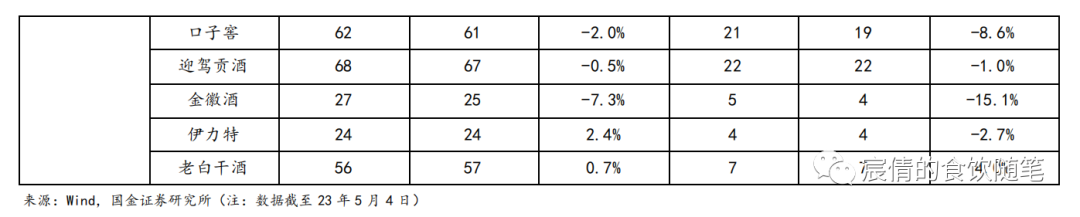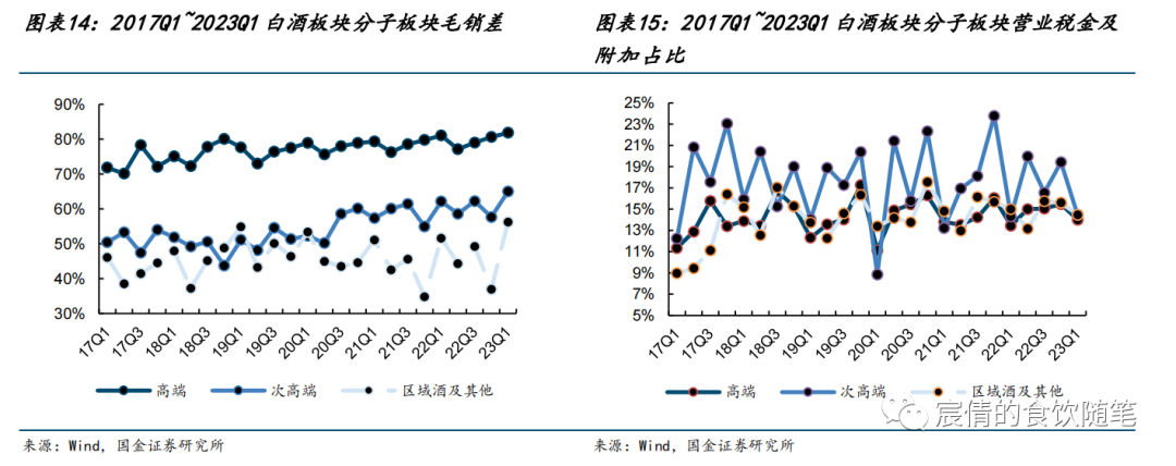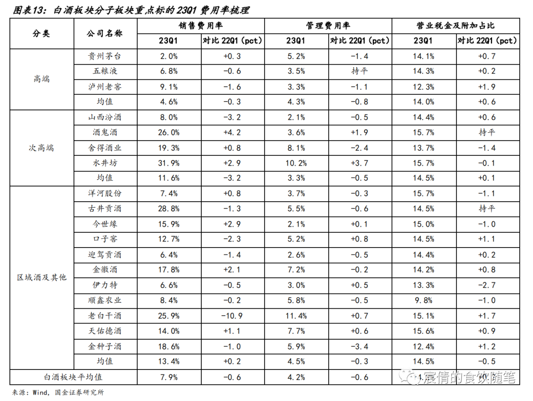 2)23Q1高端酒/次高端/区域酒及其他销售费用率分别-0.3pct/ -3.2pct/+0.2pct,管理费用率分别-0.8pct/-0.5pct/-0.3pct,营业税金及附加占比分别+0.6pct/+0.1pct /-0.5pct。