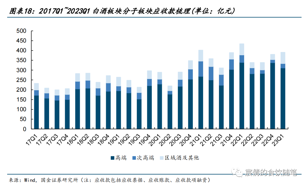3)22Q4&23Q1应收款余额均有所缩窄,22Q4、23Q1应收款余额同比-2.4%、-10.1%,销售收现回暖部分由于酒企回款政策等变化带动信用收款规模的缩窄。其中,次高端缩窄幅度较高,分别同比-70%/-42%。