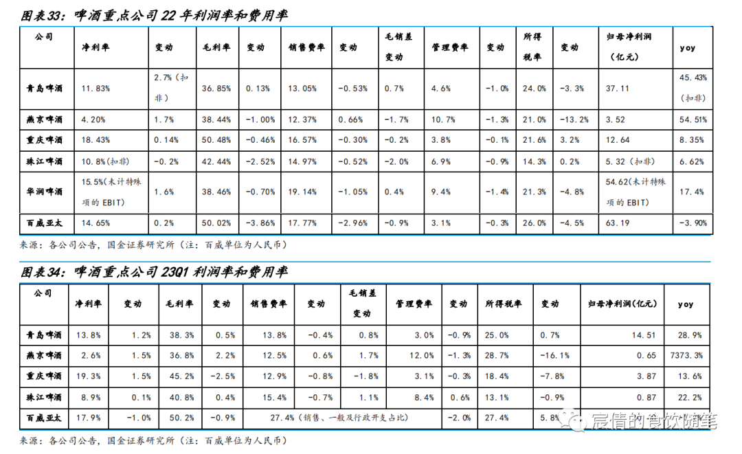Q1毛利率已转正,费率投放态度谨慎。23Q1青啤/燕京/重啤/珠江/百威毛利率同比+0.5/+2.2/-2.5/+0.4/-0.9pct,销售费率同比-0.4/+0.6/-0.8/-0.7/-2.0pct,除重啤、百威外,其余毛利率已正向变动,但幅度有限(系1月疫情影响高端化进度+采购成本使用节奏问题,预期后几个季度将明显改善),费率投放继续谨慎(部分有春节提前、费用前置的因素),带动Q1净利率普遍优化1pct以上。重啤税率降低至18.4%,系缴税节奏影响;燕京子公司减亏带动税率继续下行。