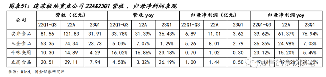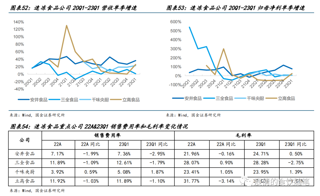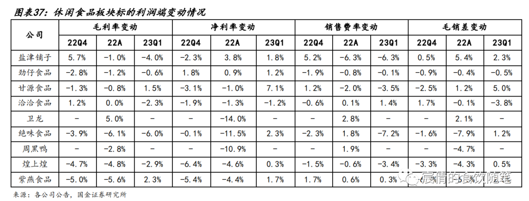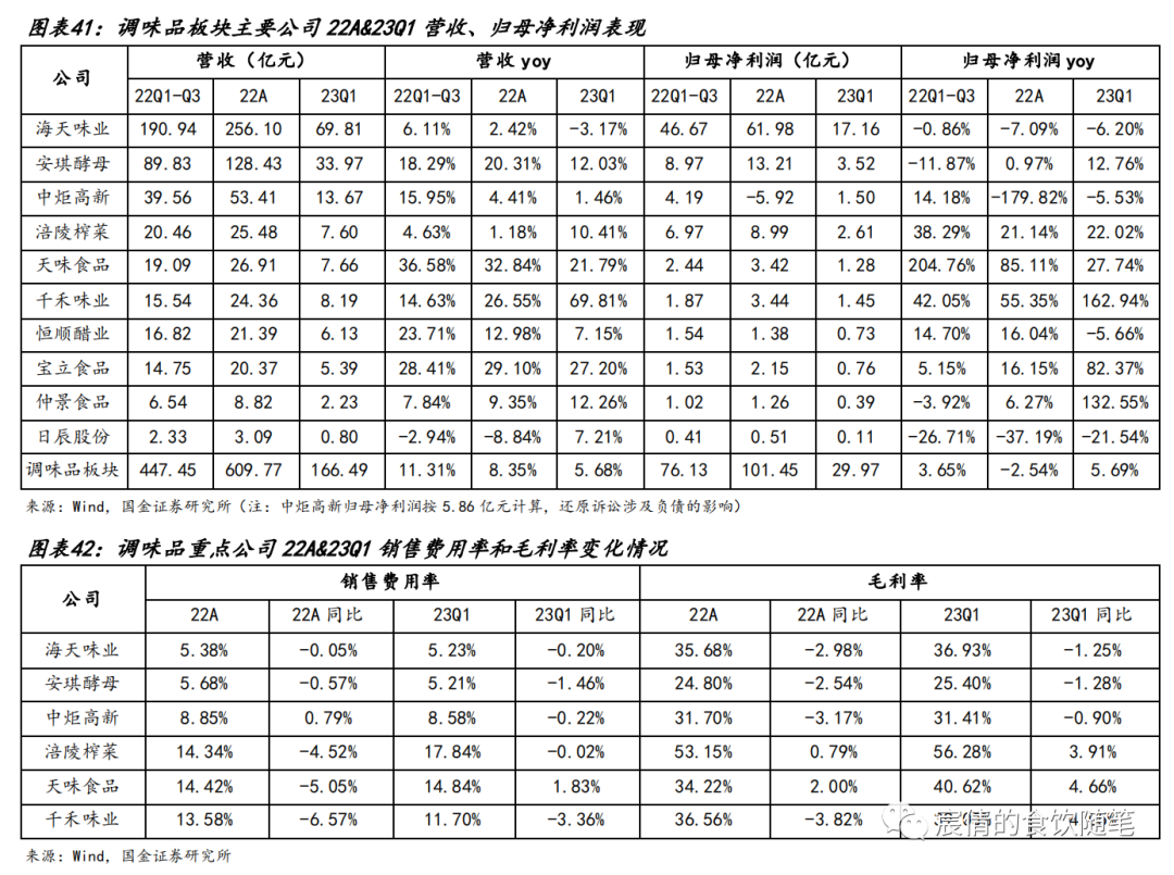 总体来看,收入端,需求不景气带来公司收入增长承压,盈利端,原材料成本相对高位带来毛利率压力,22年表现来看提价难以对冲原材料上涨,企业在销售费用率有所控制,但难抵毛利率下行,盈利能力普遍承压。23Q1趋势总体延续,但业绩增速出现环比回暖,部分公司存在季度间成本差异(榨菜)和产品结构差异(千禾)等因素毛利率改善。
