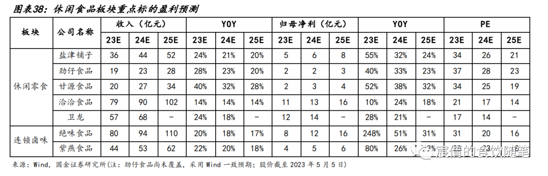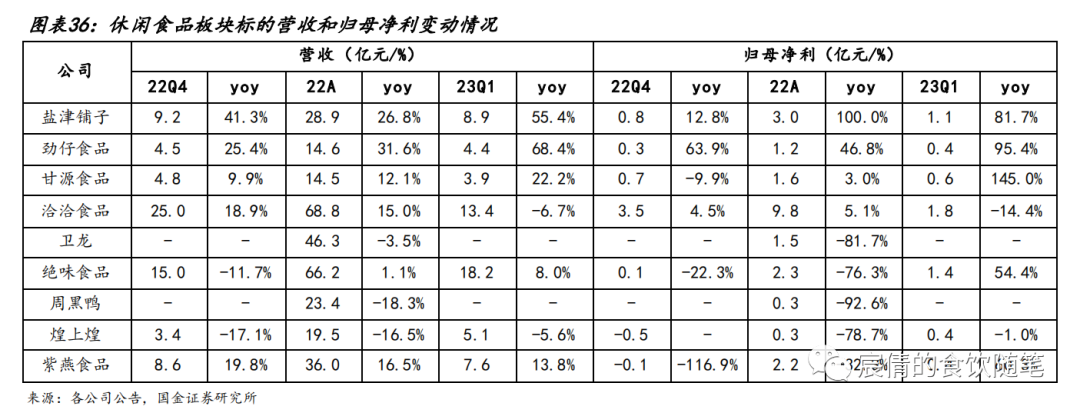 回顾22年&23Q1业绩表现,我们认为休闲食品板块内部收入存在一定的分化,差异来自于1)消费分级和降级趋势明显,因此零食专营渠道潜力不断释放,会员商超等业态逐步兴起。反观22年具备提价动作的品牌销量表现一般,且单价较高的产品动销不及预期,如洽洽坚果礼盒承压明显。2)消费场景依赖度不同,如零食倾向于家庭消费,卤味依赖出行消费,受损幅度和修复弹性不同。但我们认为23年修复节奏斜率较缓,一方面是报复性消费情绪逐步回落,另一方面是企业扩张战略更为审慎。3)企业管理层变革执行力差异。面对疫情冲击,零食面临商超渠道人流下滑风险,卤味面临单店客流量&人均消费下降风险,但各家的应对举措不同。如盐津最早进行全渠道转型,22年尽享红利。绝味疫情期间加大加盟商补贴,市占率逆势提升,以量增弥补价减。