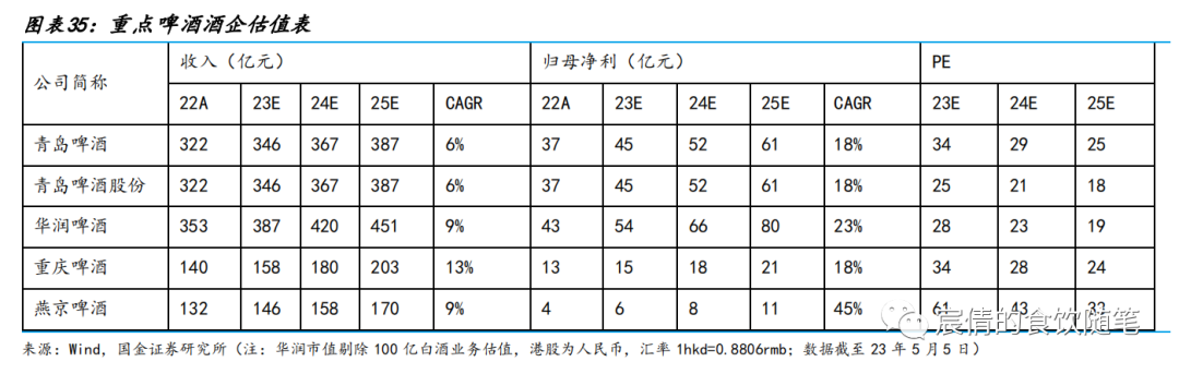 3)费投兑现程度。各家当前费用投放规划普遍低于年初预期(销售费率持平或下降),我们认为,这体现了良性竞争,也体现了费投效率提升(青啤管理咨询项目)、费用结构转变(更针对消费者、低端费用转移向高端),旺季将进一步验证。