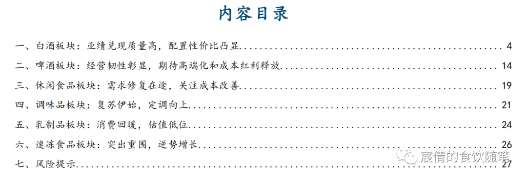 白酒:板块整体兑现质量较高。分子板块来看:1)高端酒仍延续以稳为主的特征,业绩波动较小;2)次高端景气度仍有所承压,库存去化、渠道梳理、价盘管控、消费者培育等要素为阶段性重点;3)区域酒同所在区域景气度息息相关,整体春节受益于人流收获旺销。目前板块PE-TTM为30X,位于近5年24th分位,近3年3th分位,估值已经具备较高的安全垫&充足性价比,情绪甚至弱于基本面实际的复苏演绎。短期从景气恢复的节奏来看,五一宴席释放如期而至,端午小旺季也利于库存去化,渠道对往后的信心仍存,背后的支撑点是需求恢复方向的确定性。目前优选性价比突出的高端标的,对顺周期的次高端标的建议持续关注。