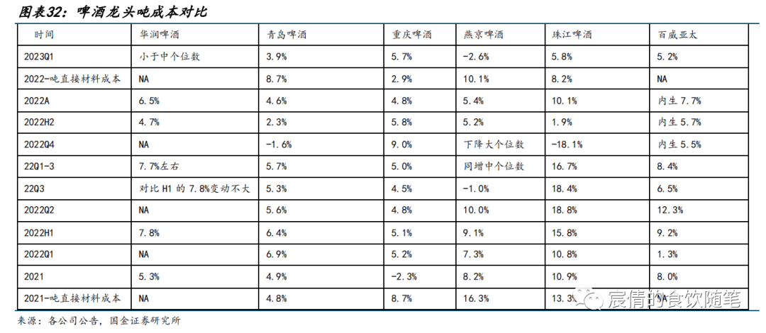 2)成本的优化进度。我们认为,包材处在下降周期(铝材、纸箱同比下滑两位数、玻璃下滑个位数),只是低价材料使用早晚的问题,未来迟早会体现。华润预计23年直接材料成本增加不超过5亿(不排除最后不增加),百威预计23年涨幅不足22年一半。此外,澳麦关税反倾销调查重启,若最终落地,将为23年大麦原料采购提供更多选择(最终大麦成本减轻幅度需看春播、收割情况)。以华润为例,过去有1/3的大麦来自澳麦,澳麦和其他进口大麦差价在个位数到双位数。