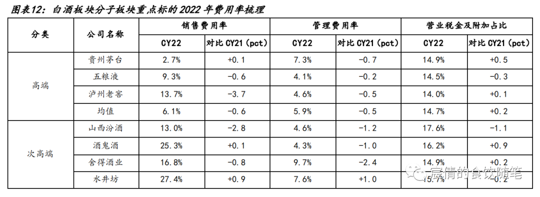 1)22年高端酒/次高端/区域酒及其他销售费用率分别-0.6pct/ -2.2pct/+1.2pct,管理费用率分别-0.5pct/-1.2pct/-0.1pct,营业税金及附加占比分别+0.2pct/-0.5pct/持平。