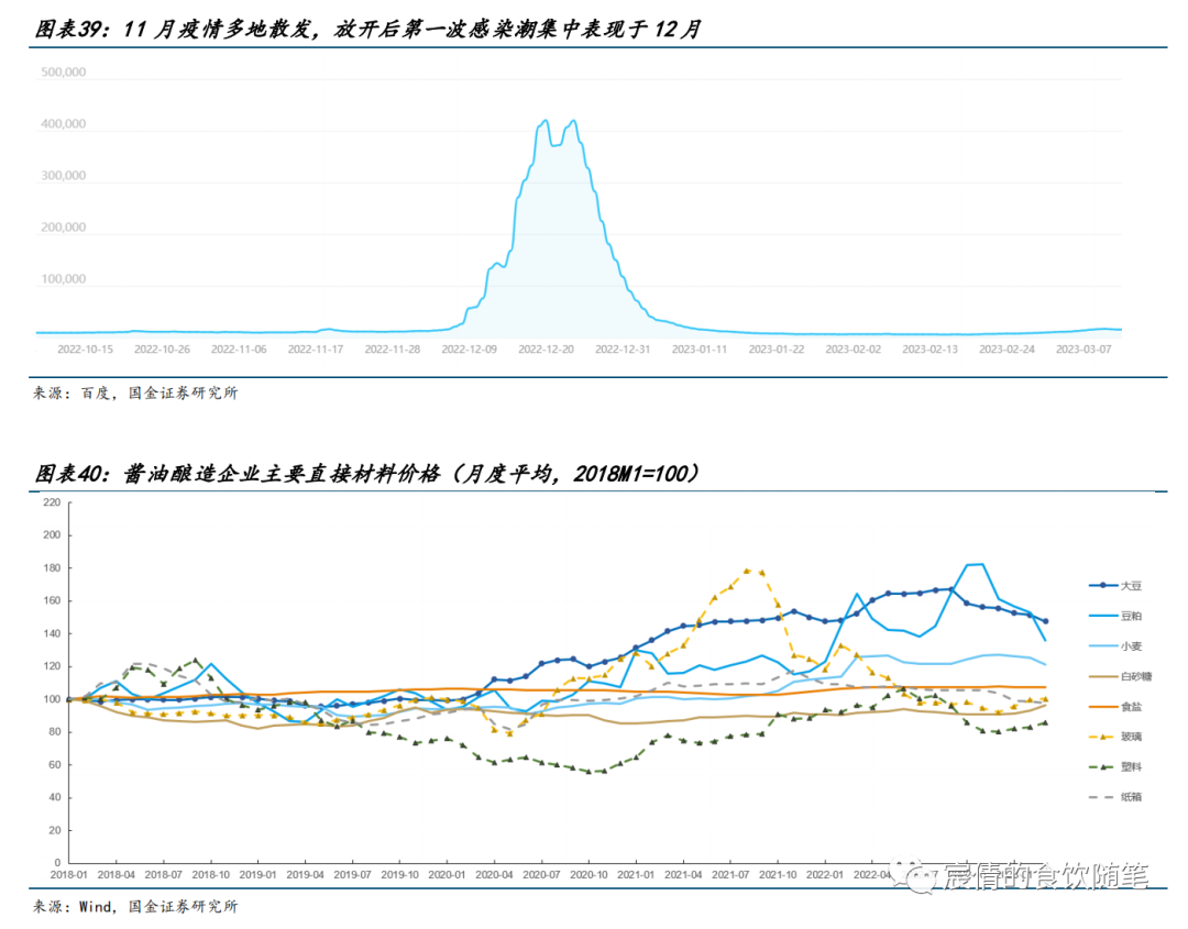 22Q4开始全国感染人数出现显著上升,一线城市北京和广州感染人数走势陡峭,彼时多地出现管制,餐饮直接受损,而11月末全国放开后,12月迎来第一波感染潮,在此期间人们更多居家以避免感染,全国范围内的餐饮均受到打击,而从元旦到春节期间伴随第一波人群的康复,迎来餐饮业的反弹行情。成本端则如前文所述,待23H2可能出现实质性改善,而22Q4和23Q1的大豆成本可参考22Q2和22Q3的大豆价格,彼时正处于22年内价格高点。