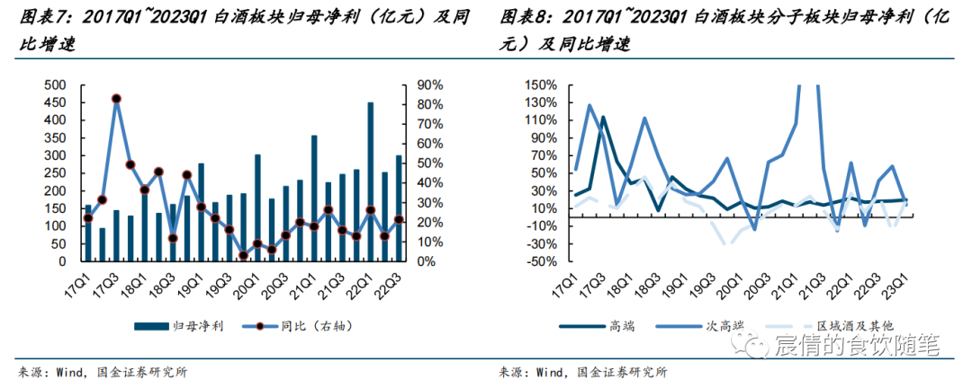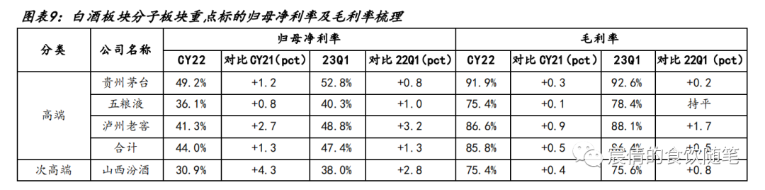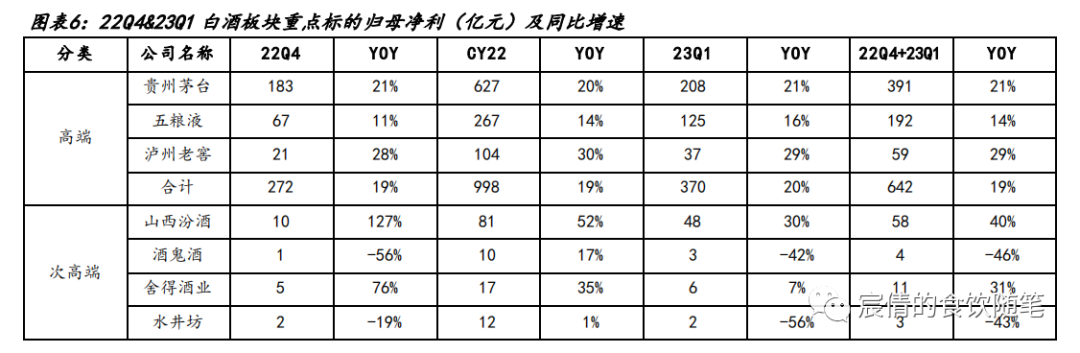2)23Q1板块整体实现归母净利535亿元(同比+19.1%),其中区域酒及其他(+19.9%)>高端酒(+19.7%)>次高端(+14.1%);