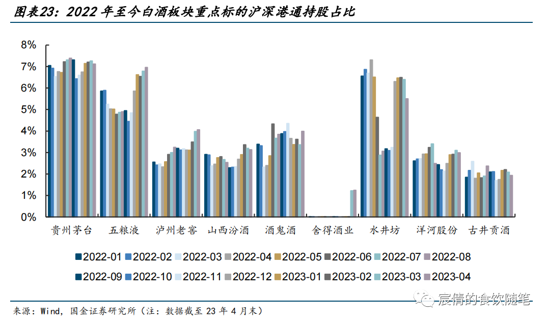 1)环比22年末,北上资金对白酒板块重点标的持股基本都有加仓表现,其中茅台/五粮液/泸州老窖/山西汾酒/酒鬼酒/水井坊/洋河股份/古井贡酒分别环比+0.4pct/+1.1pct/ +0.9pct/+0.4pct/+0.3pct/+1.2pct/-0.8pct/+0.5pct/+0.2pct。相较于20年末,茅台北上持股占比-1.2pct,而五粮液/泸州老窖占比+0.6pct/+1.8pct。