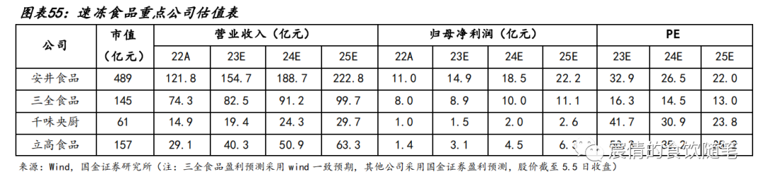业绩表现来看,安井和千味更为稳健。安井受益于其BC兼顾、南北通用的区域布局,C端锁鲜装的成功推广,以及预制菜作为第二曲线的成功打造。2022年在餐饮疲软背景下,安井传统主业速冻火锅料表现偏弱,而面米制品因2C逻辑具备韧性,预制菜增长亮眼。费用端降本增效主动控费,毛利率端通过结构改善对冲成本压力,并购新柳伍和新宏业后对鱼糜成本具备更好的掌控和平滑能力。23Q1主业回暖后,公司业绩超预期,我们看好看好公司BC兼顾、多点布局后的优秀成长性,22年显经营韧性,23年显经营弹性。千味22Q4以来大B迎来修复,百胜增长靓丽(味宝并表、上新、产品短线转长线),海底捞复苏势头足,小B稳健增长,春节期间返乡热潮下乡村宴席场景带来更好修复;同时成本压力缓解叠加产品结构改善助力利润释放。立高22年核心渠道饼店、商超均受损,内部渠道融合亦有有所拖累,23年渠道流量复苏的同时,Q1山姆多款新品上市+老品升级调价,后续有望持续贡献增长。