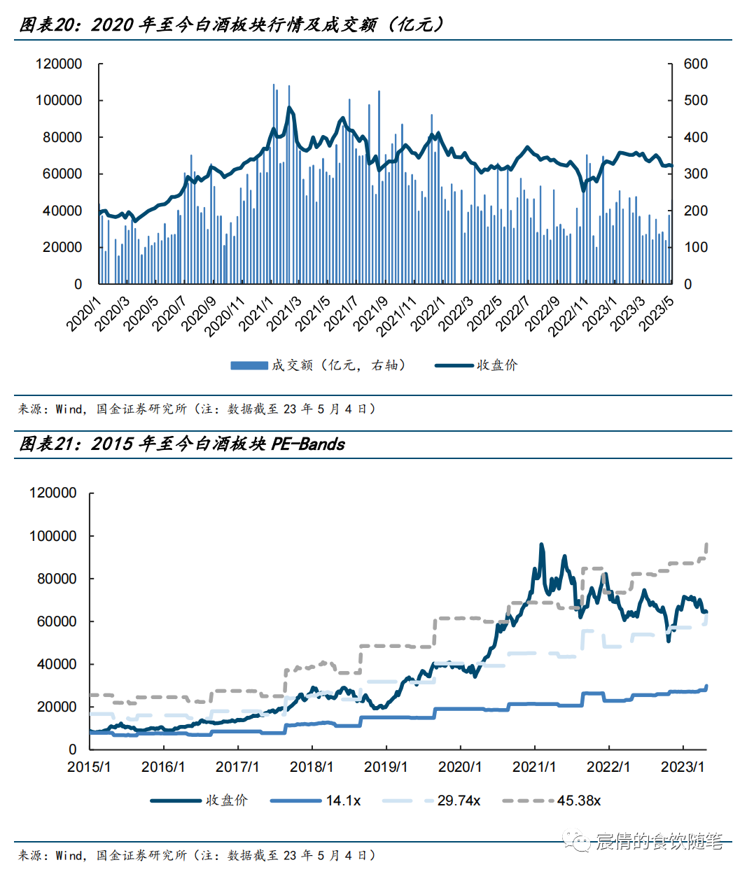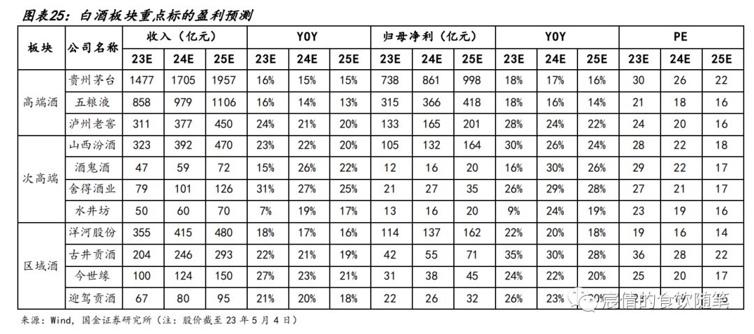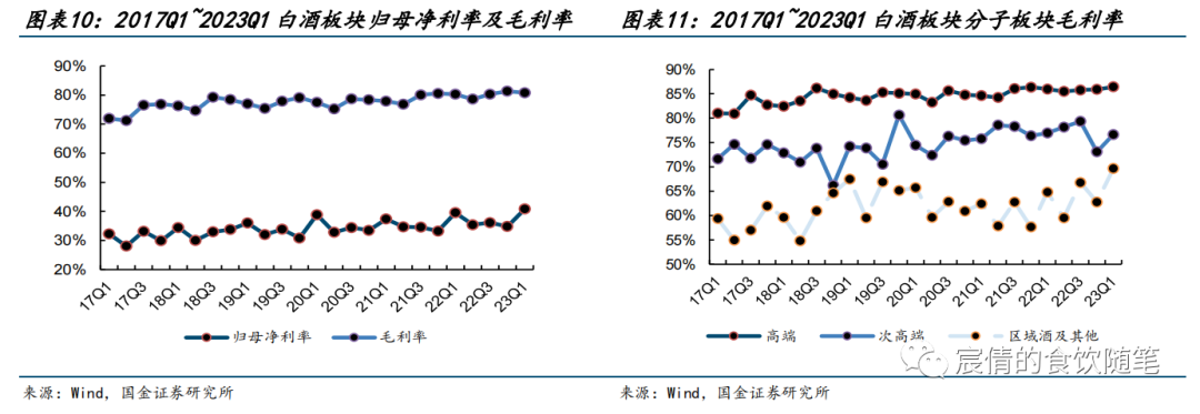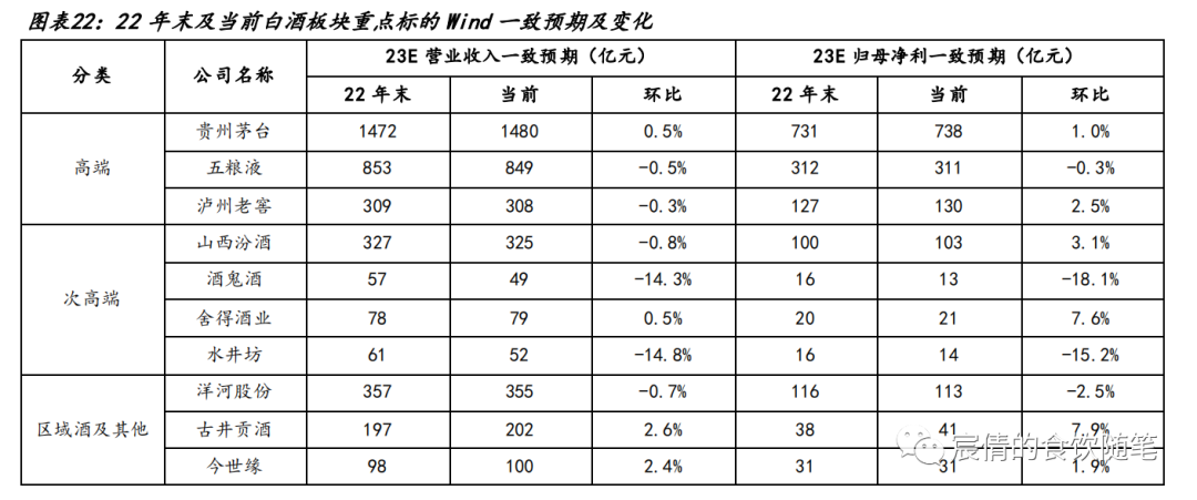 3)结合22Q4&23Q1,板块整体实现归母净利840亿元(同比+18.6%),其中次高端(+21.8%)>高端酒(+19.2%)>区域酒及其他(+13.4%)。整体板块仍呈现出明确的利润弹性,相对而言次高端弹性占优,但波动亦较高。