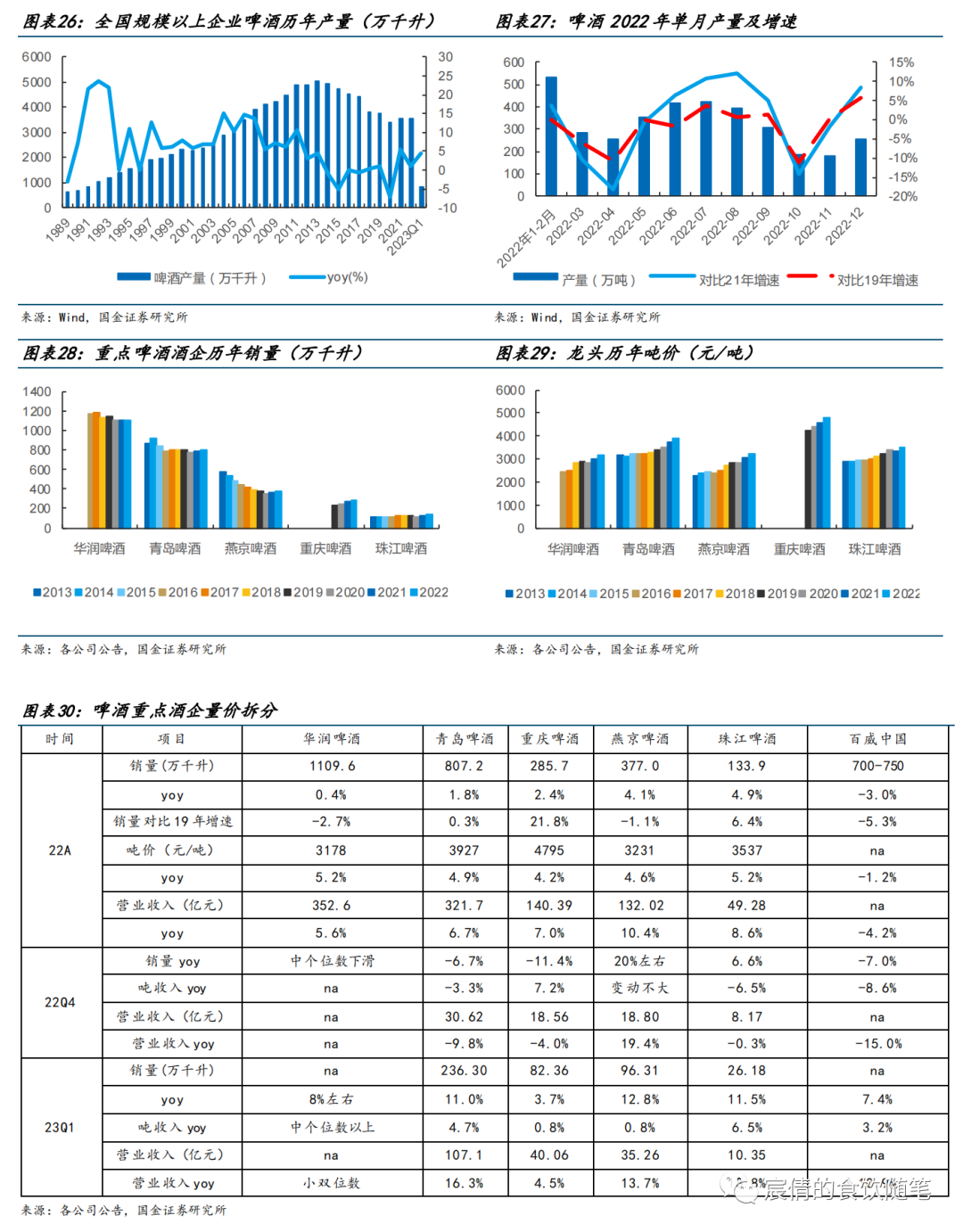 23年1-2月高基数下仍有增长,3月高增,Q1普遍超预期。23Q1全国规模以上啤酒企业产量为852.70万千升,同比+4.5%;其中青啤/重啤/燕京/珠江/百威中国销量同比+11.0%/+3.7%/+12.8%/+11.5%/+7.4%。1-2月龙头增速普遍在中个位数,3月普遍在双位数,主要系餐饮、夜场等场景加快复苏(港股龙头餐企、小酒馆同样超预期修复),叠加渠道提前备货。重啤受BU改革、疫情的影响,销量表现偏弱,但环比改善趋势明显(1月下滑, 3月增速20%)。