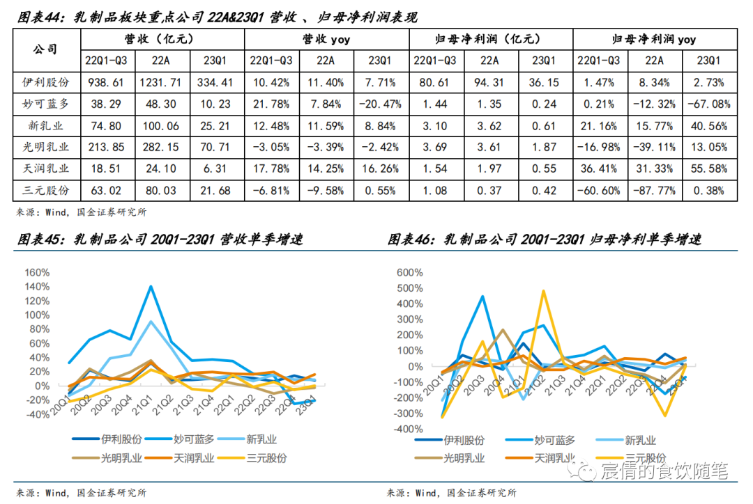 收入表现来看,22年需求表现走弱,受到消费力制约和场景缺失影响,双强(内生)收入表现均较弱。盈利表现来看,22年原奶价格走低,存在一定正向贡献,但大包粉、包材、干酪等价格有所上涨,总体成本变化不大,结构升级受阻带来的负面影响制约了盈利能力,最终兑现为22年全年乃至23Q1的净利率下修。