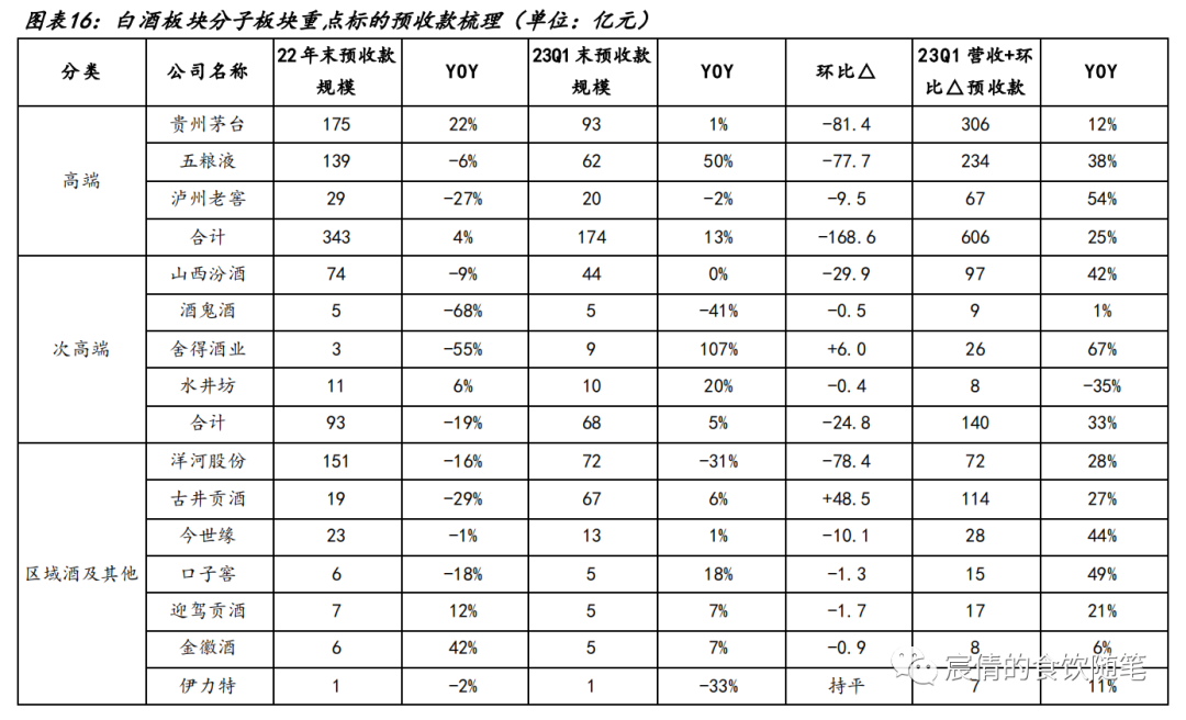3)结合22Q4&23Q1,板块整体实现营收2172亿元(同比+14.4%),其中高端酒(+16.2%)>区域酒及其他(+12.4%)>次高端(+8.9%)。