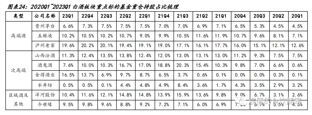 3)从重仓持股市值来看,茅台/五粮液/泸州老窖/汾酒/洋河/古井基金重仓持股总市值分别为1508/776/733/376/259/229亿元,同比-4.3%/+4.7%/+10.5%/-12.7%/-7.0%/+7.4%。