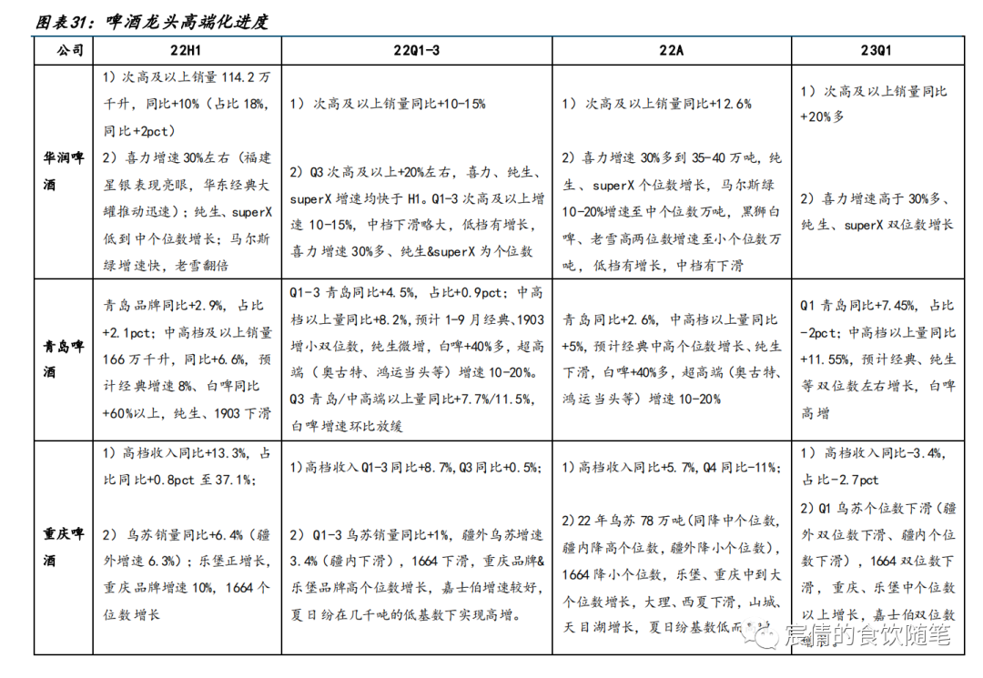 1)高端大单品放量的节奏。分2方面,一看22年抗住疫情压力仍保持高势能的大单品,在享受前期铺货红利后如何在更多区域起势、动销、维持阿尔法(例如:喜力看福建、浙江和广东;U8);二看22年疫情之下受损偏重,23年现饮恢复弹性大+自身有改革变化的大单品(例如:乌苏、superX等)。我们认为,高端化的2条逻辑(基地市场升级、大单品全国化)将在今年演绎充分,各家都在补齐短板(重啤BU调整、华润优化3+2产品组合),最终高端取得胜利的会是产品、品牌、渠道综合强势的公司。
