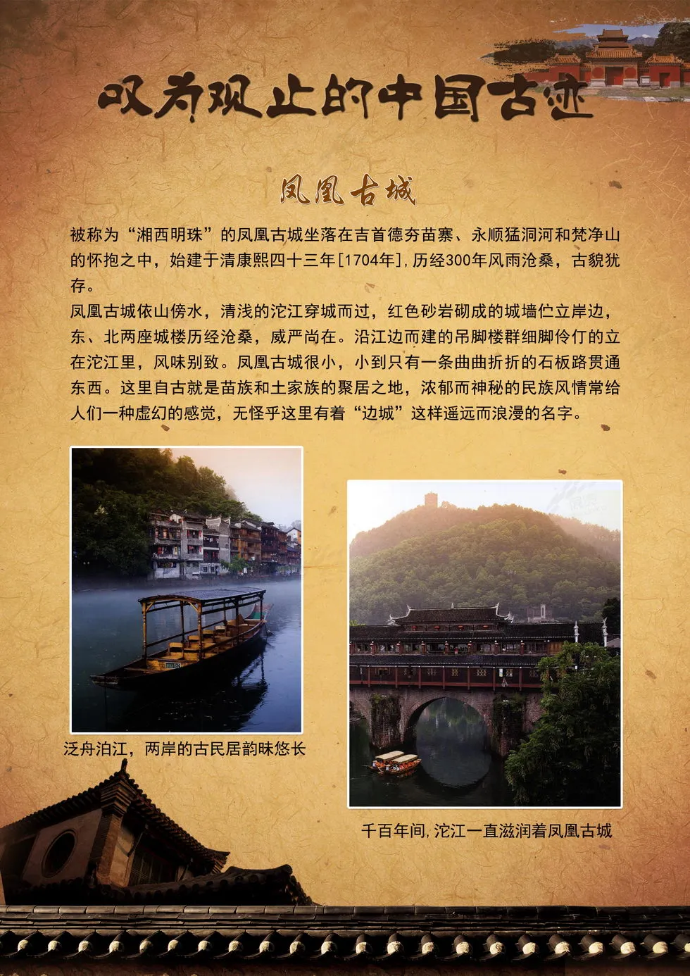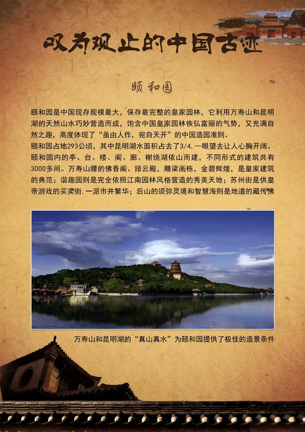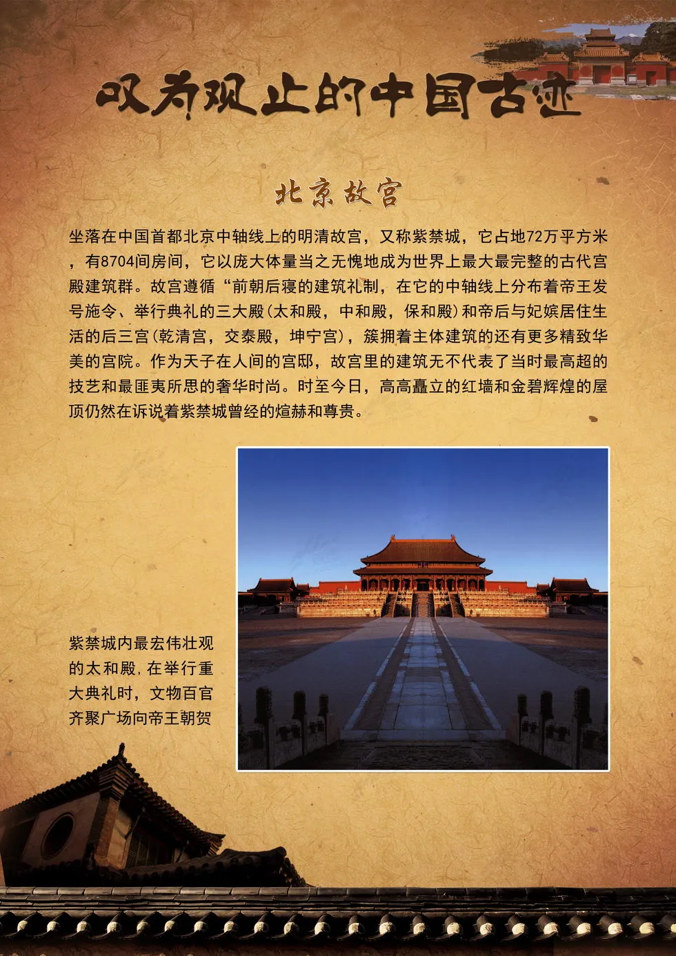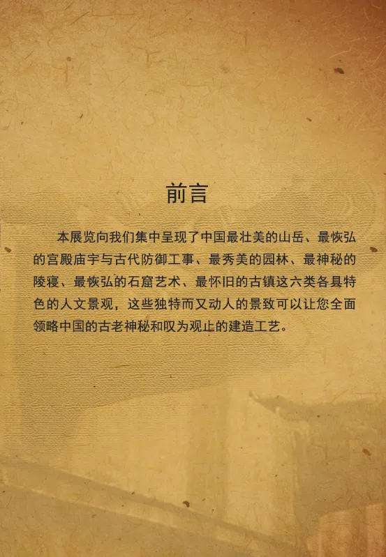 本展览向我们集中呈现了中国最壮美的山岳、最恢弘的宫殿庙宇与古代防御工事、最秀美的园林、最神秘的陵寝、最恢弘的石窟艺术、最怀旧的古镇这六类各具特色的人文景观,这些独特而又动人的景致可以让您全面领略中国的古老神秘和叹为观止的建造工艺。