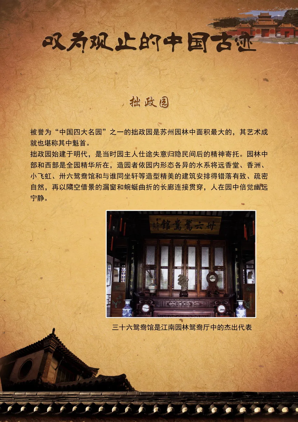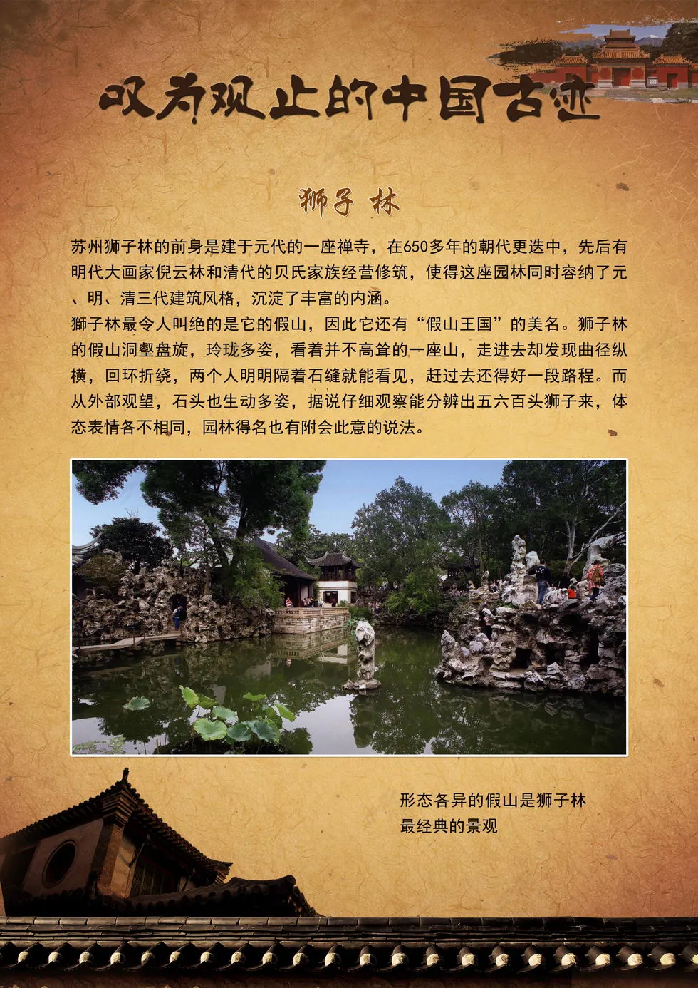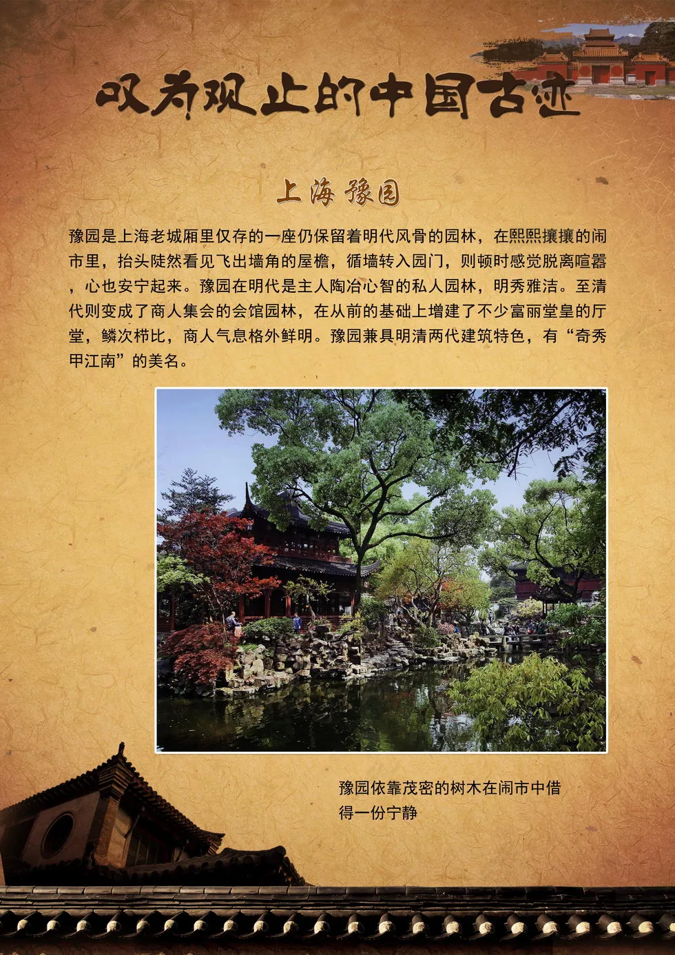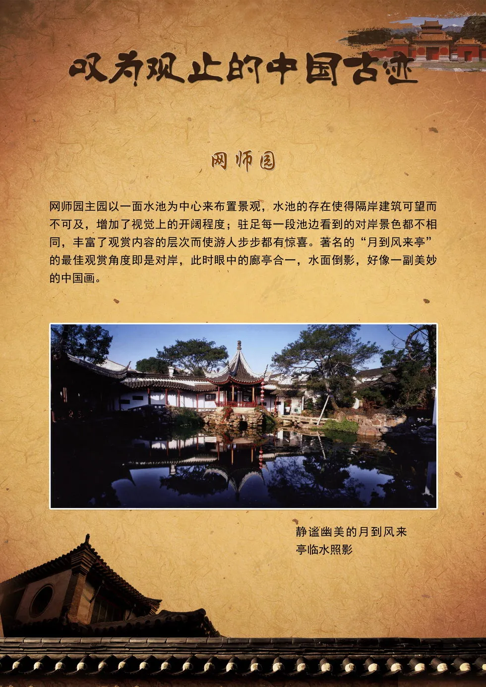 本展览向我们集中呈现了中国最壮美的山岳、最恢弘的宫殿庙宇与古代防御工事、最秀美的园林、最神秘的陵寝、最恢弘的石窟艺术、最怀旧的古镇这六类各具特色的人文景观,这些独特而又动人的景致可以让您全面领略中国的古老神秘和叹为观止的建造工艺。