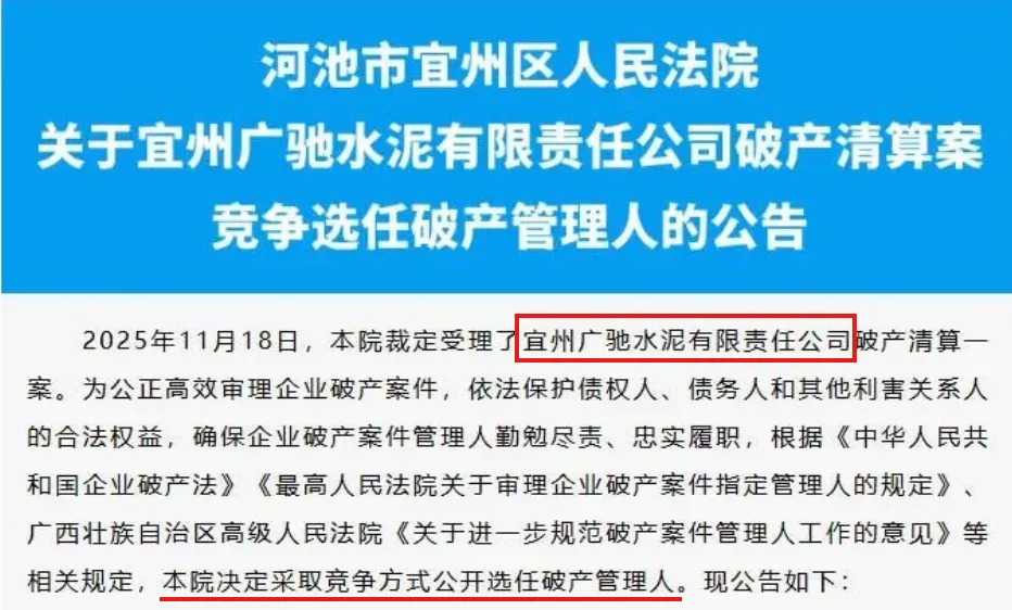 早在2025年11月18日,河池市宜州区人民法院已依法裁定受理宜州广驰水泥破产清算一案。法院依据企业破产相关法律法规,决定以公开竞争方式选任破产管理人,推动破产清算工作有序落地。