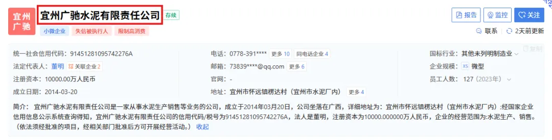 公开工商信息显示,宜州广驰水泥成立于2014年3月20日,注册资本1亿元,注册地位于广西河池市宜州区,核心经营范围为水泥生产与销售,是桂西北地区具备一定产能规模的水泥生产企业,企业核心资产为一条2500t/d新型干法水泥熟料生产线,该生产线曾是当地基建工程水泥供应的重要支撑。