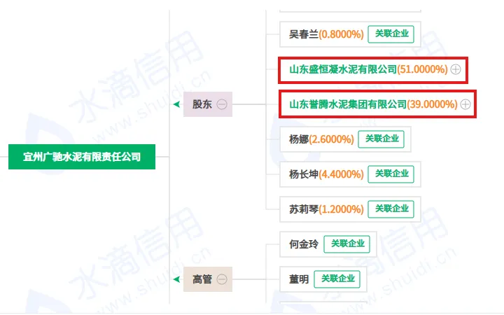 股权结构穿透后可见,宜州广驰水泥的控制权牢牢掌握在张才奎家族手中。企业股权由两家山东水泥企业分别持有:山东盛恒凝水泥有限公司持股51%,为绝对控股股东;山东誉腾水泥集团有限公司持股39%,两者合计持股比例达90%,剩余10%股权由其他股东持有。而这两家控股企业,均属于张才奎家族旗下水泥产业板块,是其布局全国水泥市场的重要主体。