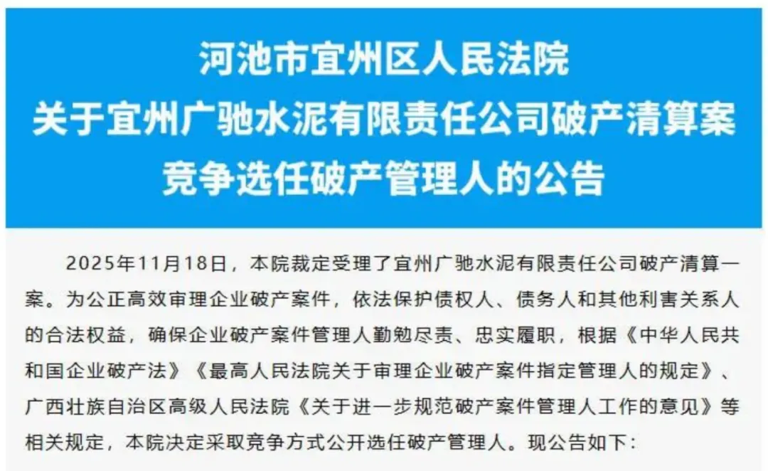 2025年3月25日,广西河池市宜州区人民法院发布公告,拟通过竞争方式公开选任宜州广驰水泥有限责任公司破产清算案的管理人。该案于2025年11月18日被法院裁定受理,为提升破产案件审理效率、保障各方合法权益,法院决定依法采取竞争性方式选任合适的破产管理人。