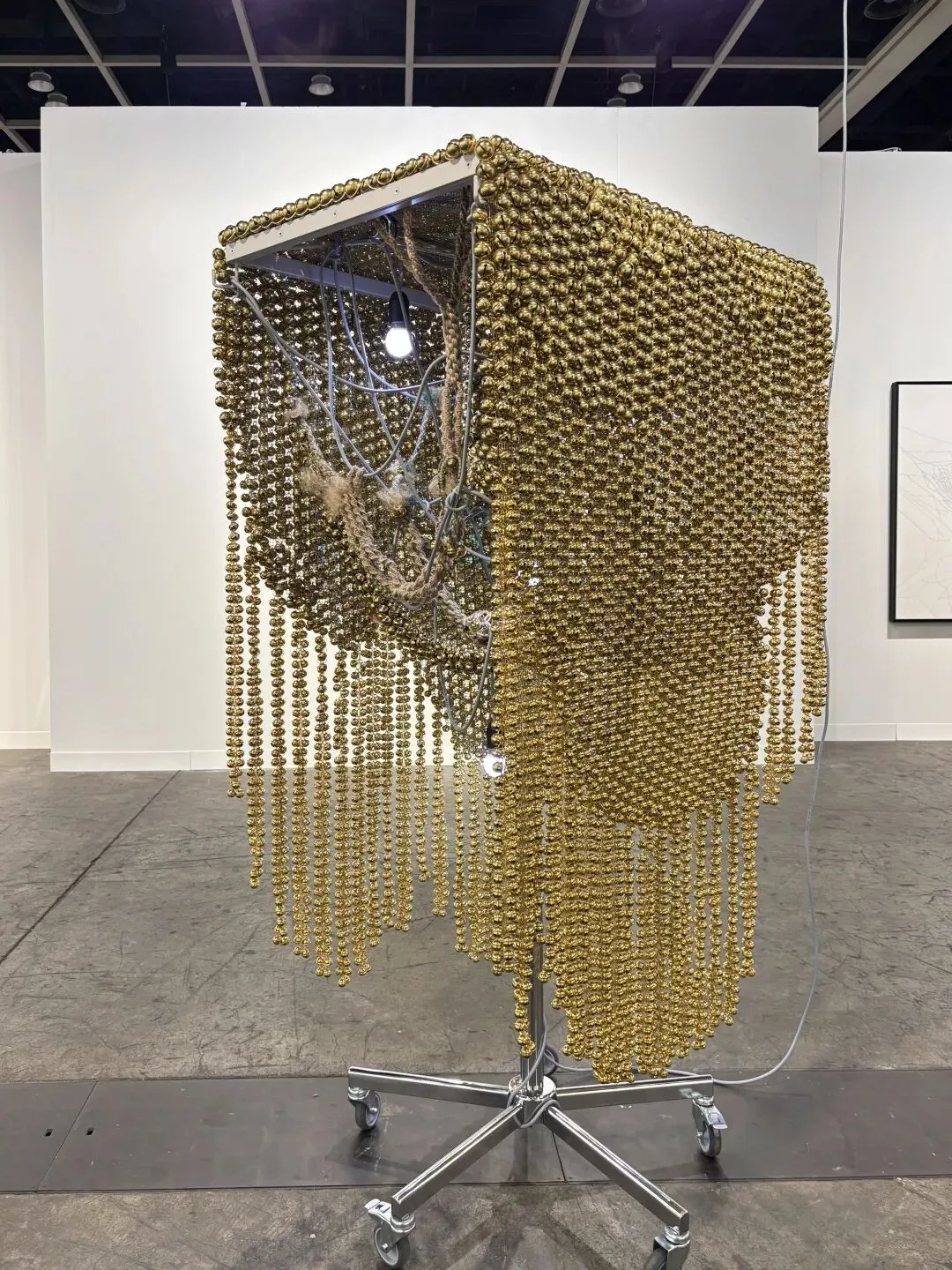 2026年巴塞尔艺术展香港展会上梁慧圭的《Sonic Fabric over Brass Plated Web》(2015)作品现场,由neugerriemschneider呈现