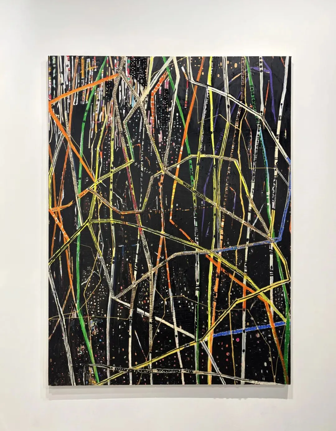 作品核心:泰国艺术家吴东萨克·克瑞沙纳米思以报纸、玻璃纸、干面条等非传统媒材创作,《纠缠起舞》以胶合板为基底,层叠繁复的扭曲线条、标志性色带与沉郁背景,集中体现了其对都市生活碎片化、感官过度饱和的反思。
