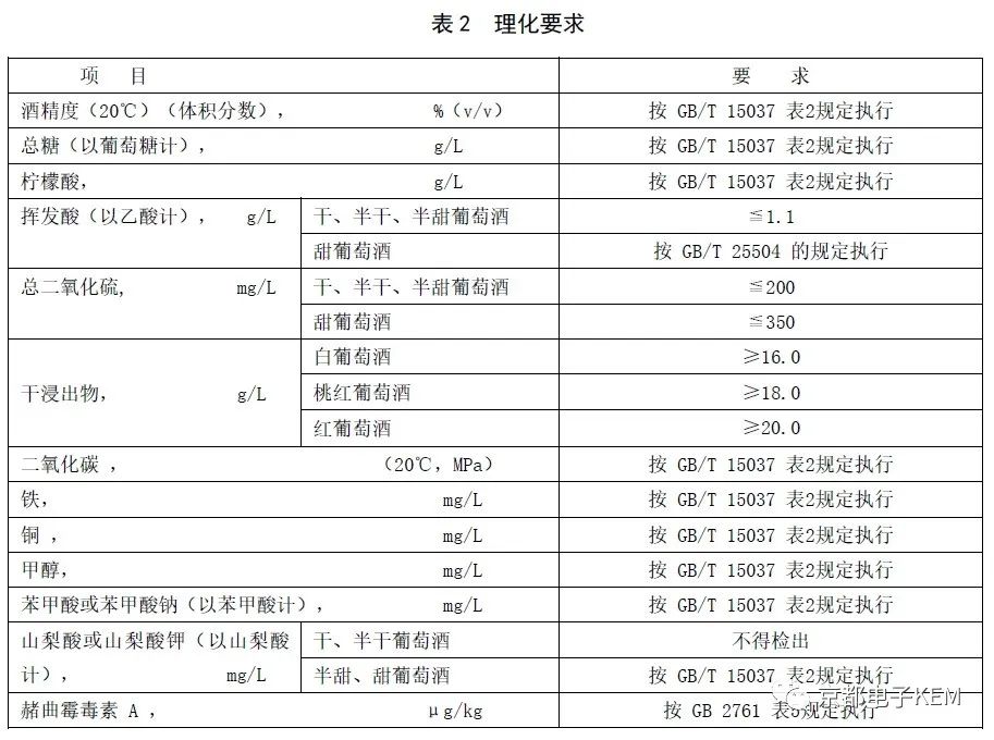葡萄酒理化要求应符合表2规定。