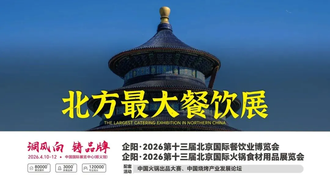 企阳·2026第十三届北京国际餐饮业博览会(简称:企阳北京餐饮展)将于2026年4月10日至12日在北京中国国际展览中心(顺义馆)举办。预计展览面积8万平方米,汇聚3000余家展商。展品涵盖预制菜、火锅烧烤食材、调味品、酒水饮品、餐厨设备及食品加工机械等餐饮全产业链。