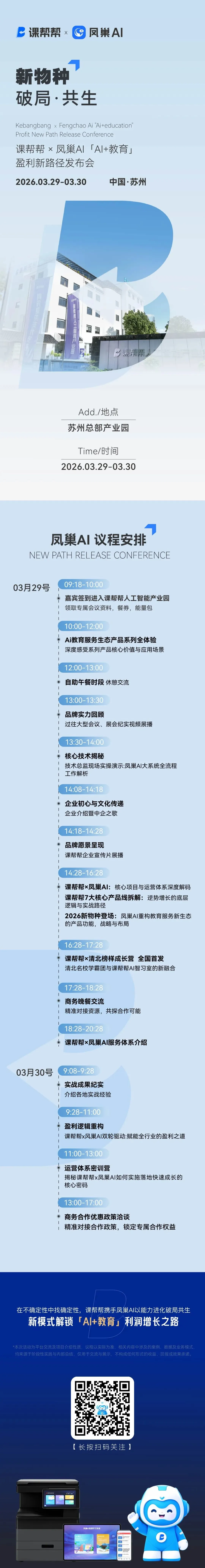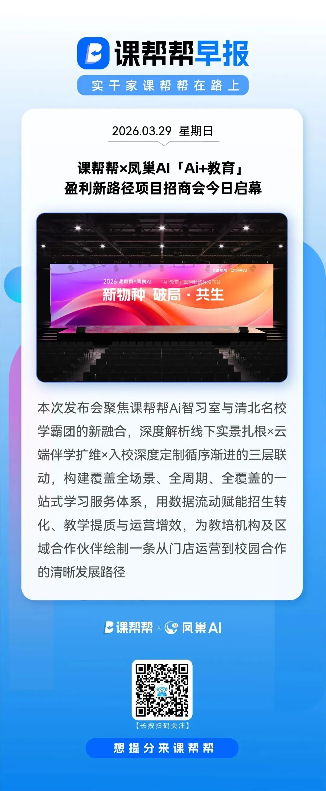 【03.29早报】课帮帮x凤巢AI「Ai+教育」盈利新路径项目招商会今日启幕