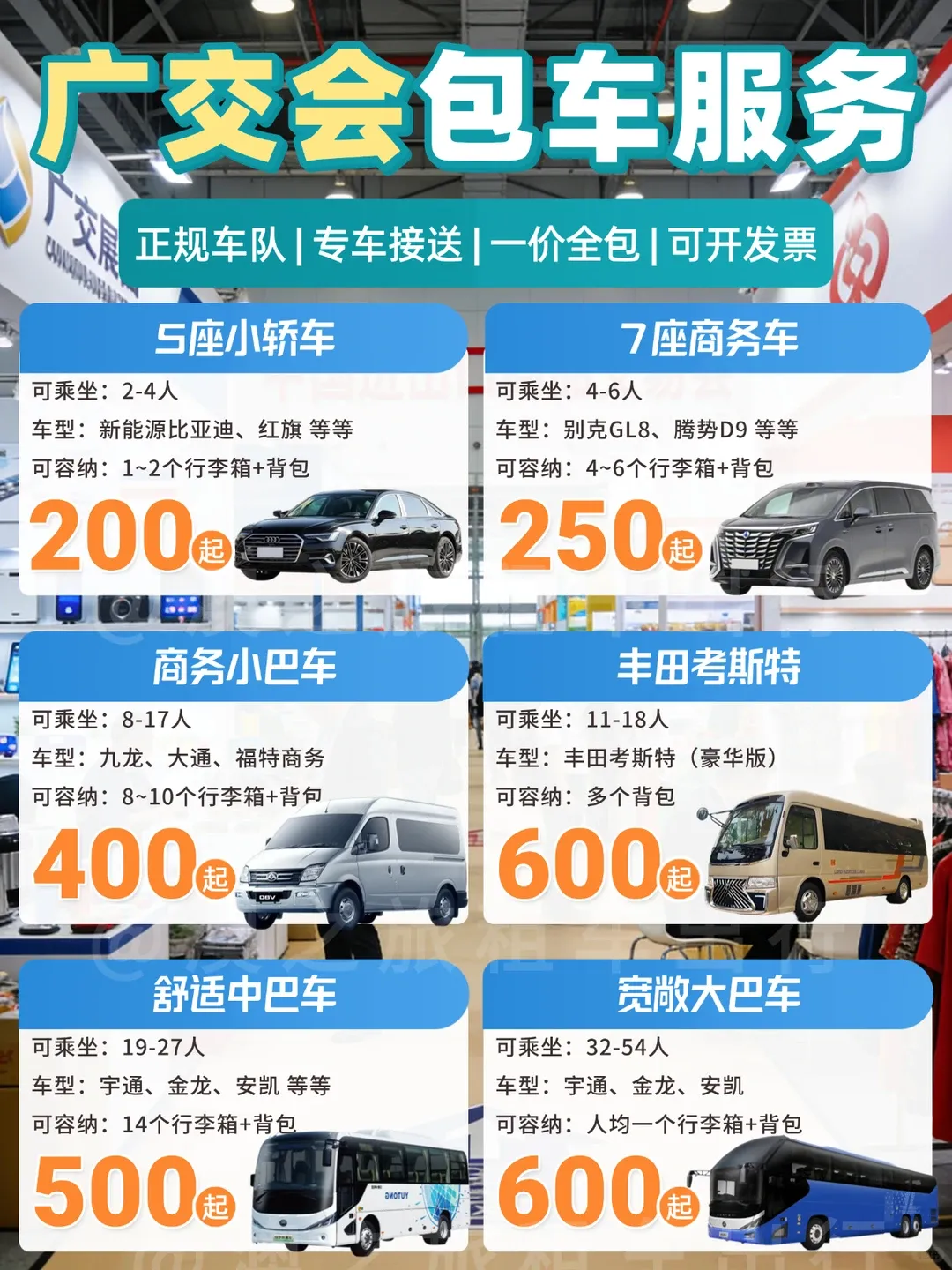 ?商务小巴|8-17人|400元起,适合:团队参展或集体出行,放8-10个行李箱,九龙/大通/福特商务