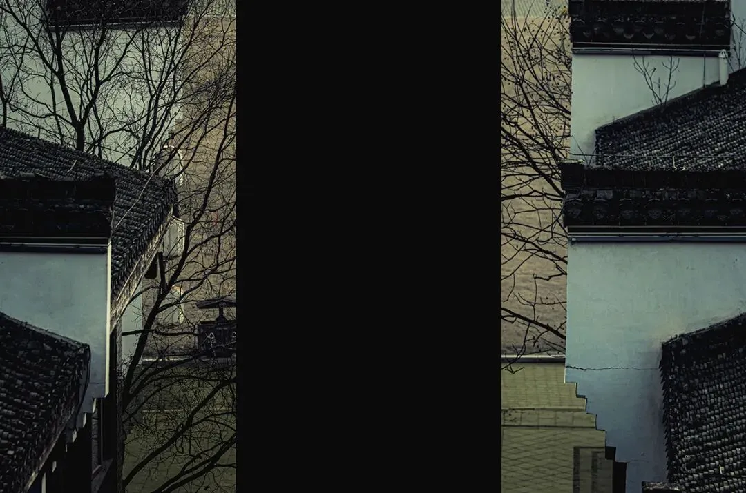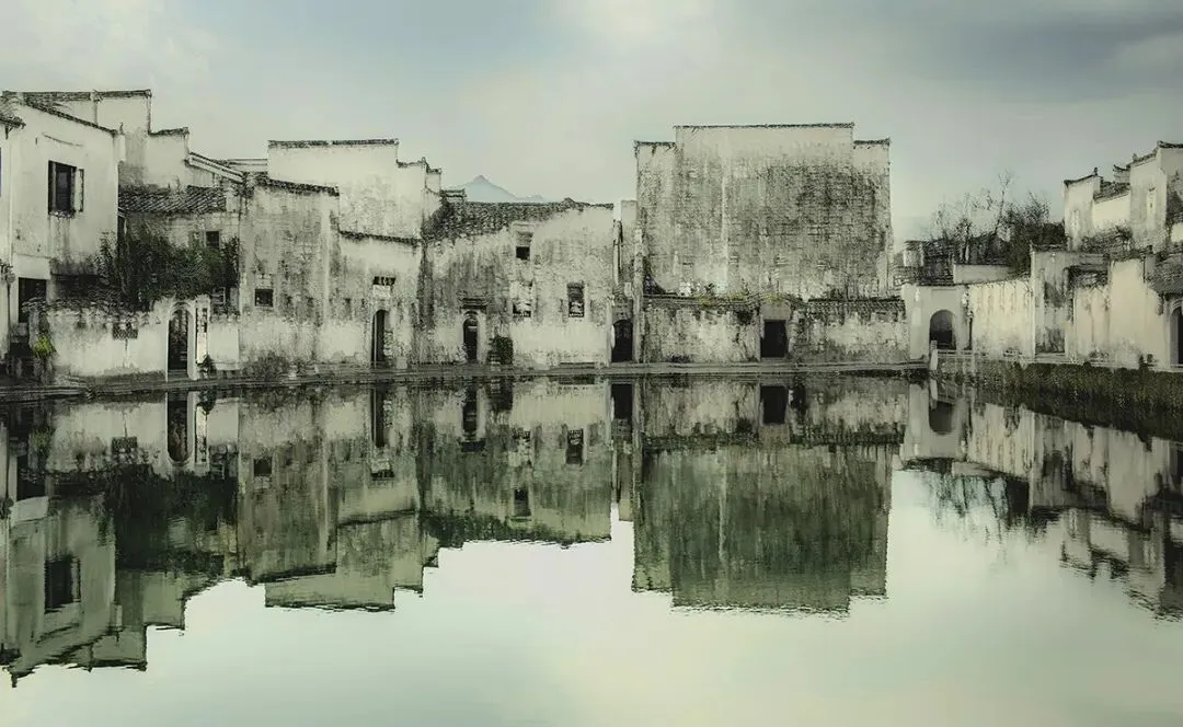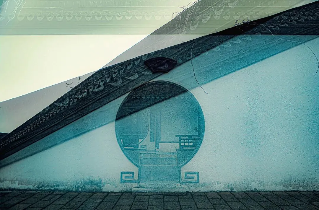 马头墙、月洞门、宏村月沼的倒影,在多重曝光与低饱和色调的处理下,脱离了写实的桎梏。