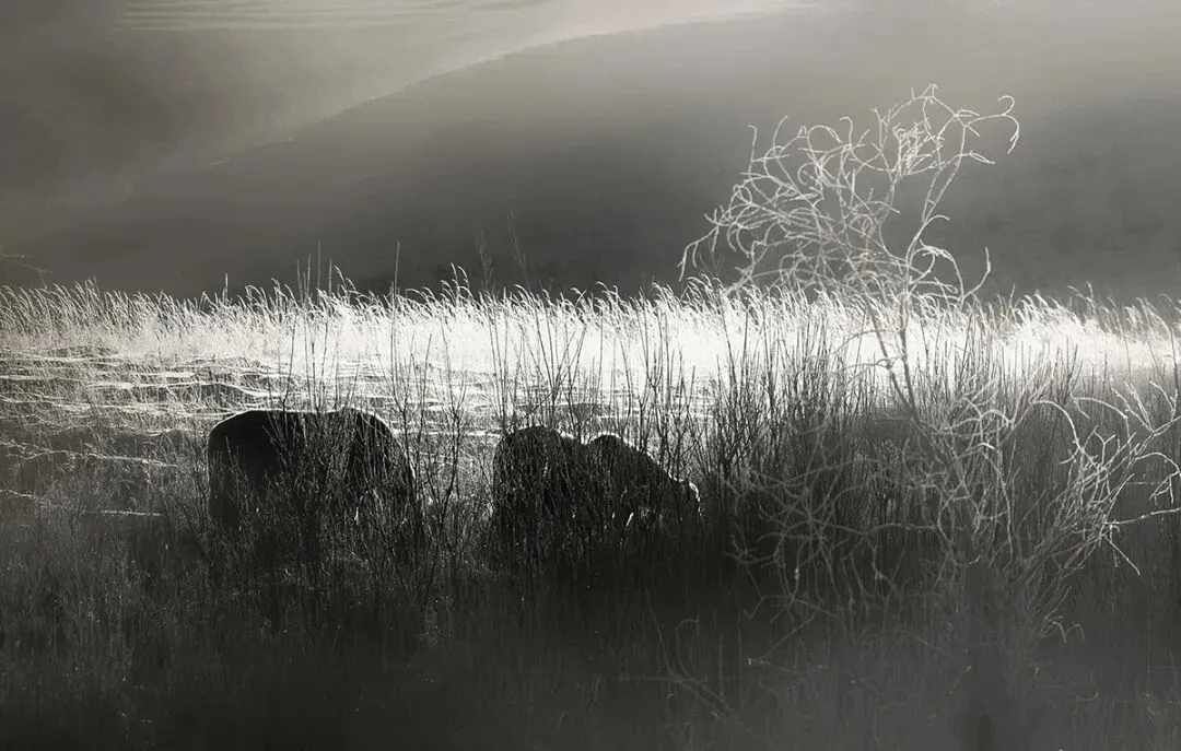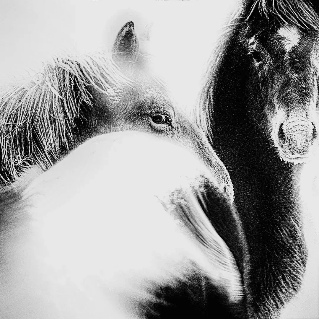 无论是《双马》中黑白对比下的亲昵瞬间,还是《奔马》里如版画般充满力量感的群马剪影,创作者都摒弃了对动物形态的精准描摹,转而捕捉其内在的精神气质。