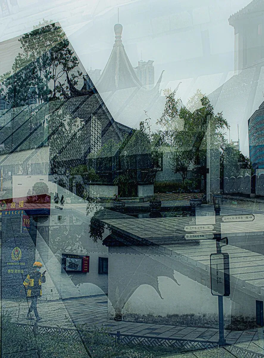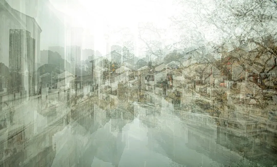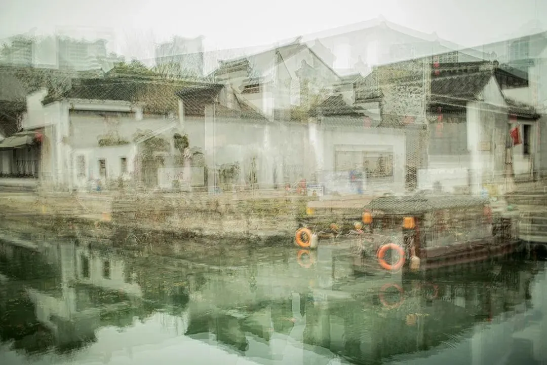 《墙》里的圆洞门叠印着中式座椅的虚影,像是时空在白墙上落下的拓片;《叠城》将古建飞檐与现代街景层叠交织,让传统肌理与当代烟火在碰撞中共生;《月沼》则以近乎单色的沉静,让徽派建筑的硬朗轮廓在水面柔化成晕染的墨色,恰似一幅徐徐展开的长卷。