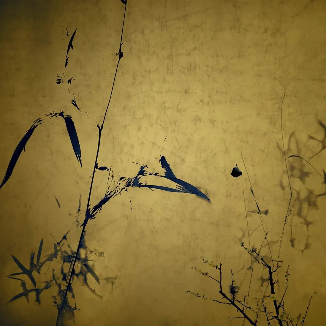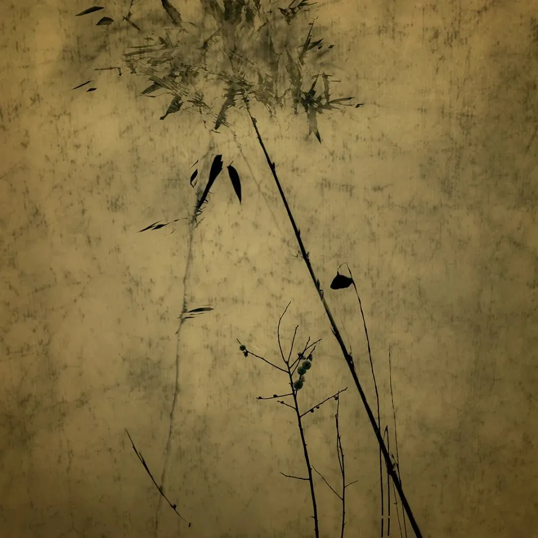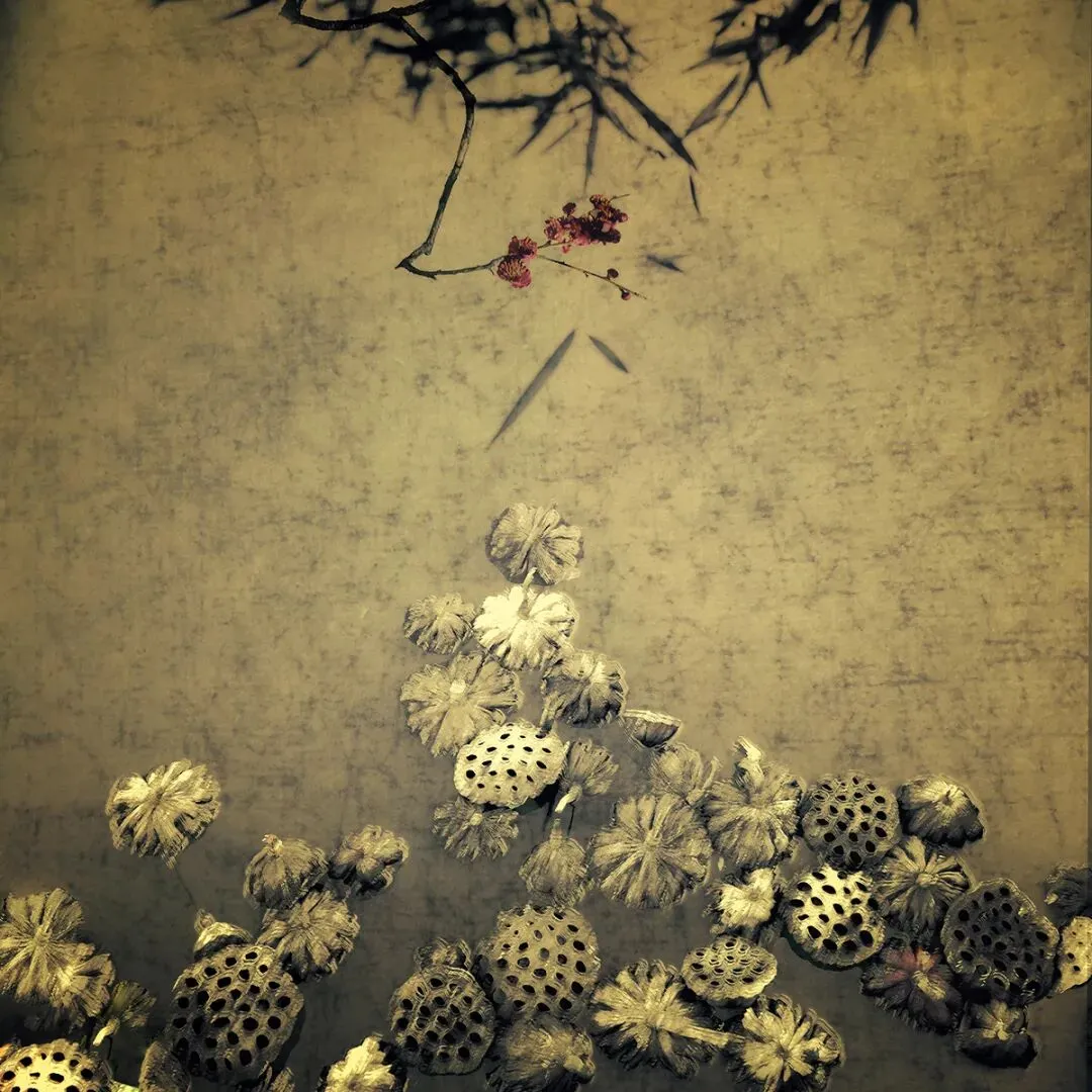 《残荷》以复古的赭黄为底,将莲蓬与枯枝的剪影排布成疏密有致的视觉节奏;《梅竹图》则用极简的黑白剪影,还原了文人画中“梅竹双清”的清雅品格。