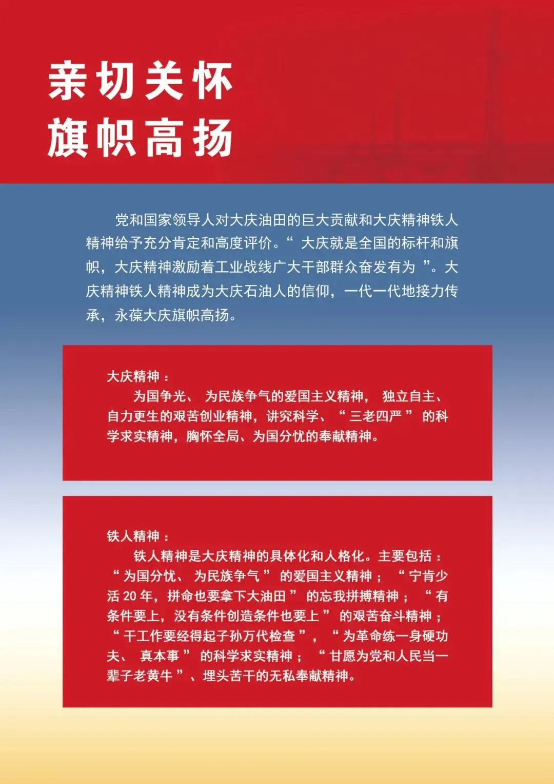 铁人王进喜是中国石油工人的光辉典范,中国工人阶级的先锋战士,中国共产党人的优秀楷模,中华民族的英雄。1960年王进喜率1205钻井队来到大庆,他为祖国石油工业的发展和社会主义建设立下了不朽的功勋,在创造了巨大物质财富的同时,还给我们留下了宝贵的精神财富——铁人精神。铁人精神是“爱国、创业、求实、奉献”大庆精神的典型化体现和人格化浓缩,大庆精神(铁人精神)是中华民族伟大精神的重要组成部分,首批纳入了中国共产党人精神谱系。纪念馆以《爱国、创业、求实、奉献——石油魂》为主题,客观、真实地展示了铁人王进喜的生平业绩及用终生实践所体现的铁人精神。由序厅《石油魂》、《不屈的童年》、《赤诚报国》、《艰苦创业》、《科学求实》、《无悔奉献》、《鞠躬尽瘁》、《精神永存》和尾厅《永远的铁人》九部分组成。如今,已成为我国最具石油特色的文化景观,弘扬民族精神的神圣殿堂,石油工人的精神家园。